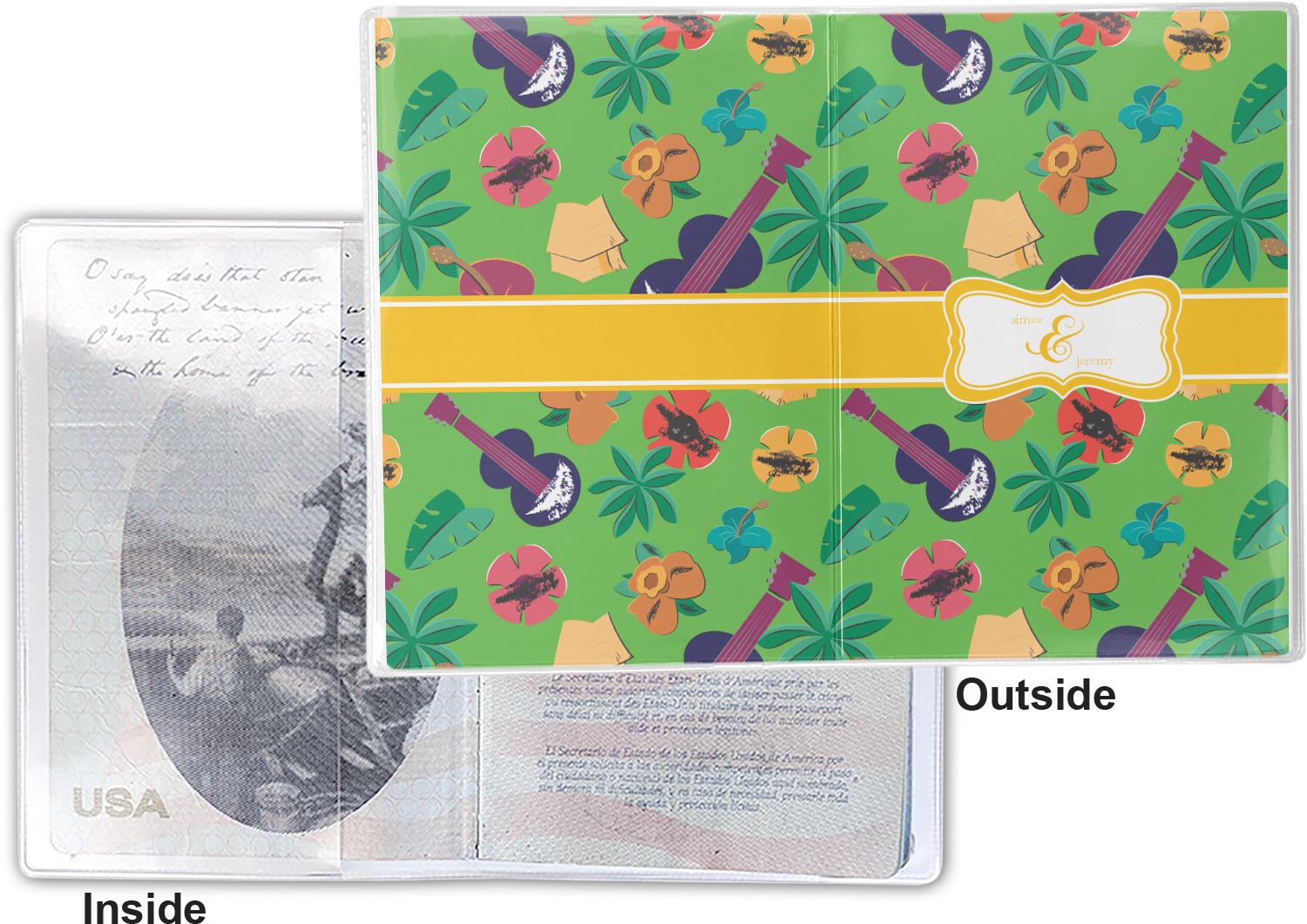 This cover is made of a sturdy clear vinyl with a personalized vinyl insert inside. There is a large and a small pocket on either side to hold the covers of your passport easily and firmly. The passport holder is approximately 7.5" x 5.25", the perfect size to snugly fit your passport. This slim cover is the perfect way to protect your passport without being one more bulky item you have to carry.