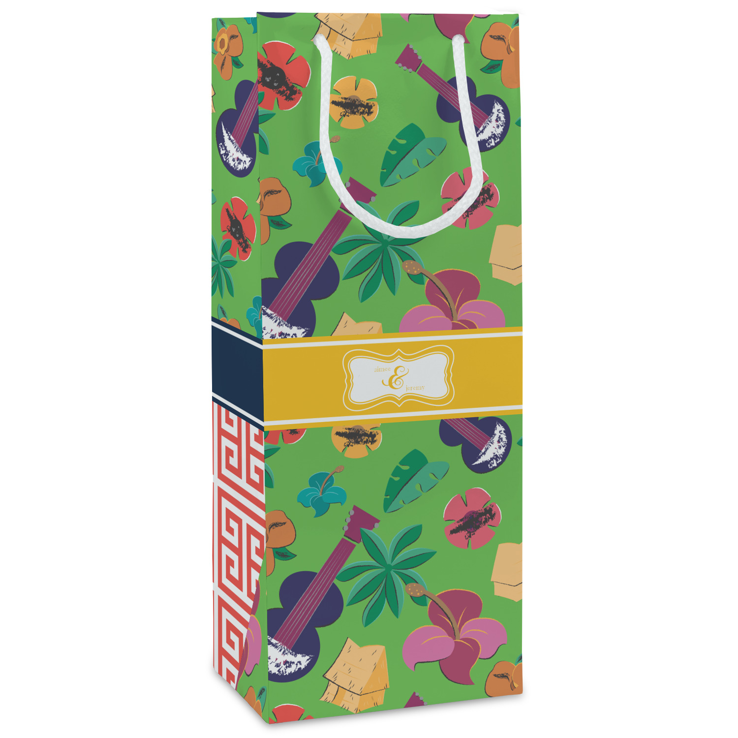Our wine bags are printed on premium paper. The bags are then cut, scored and folded. The handles and cardstock base it attached. These custom wine bags are printed and made in the USA.