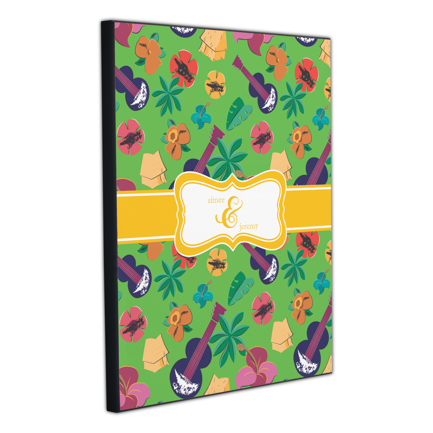 What's more classic Hawaiian than ukuleles, tiki huts, and flirty flowers? This bright design will send you straight back to better days, spent lounging on a beach in some tropical paradise.