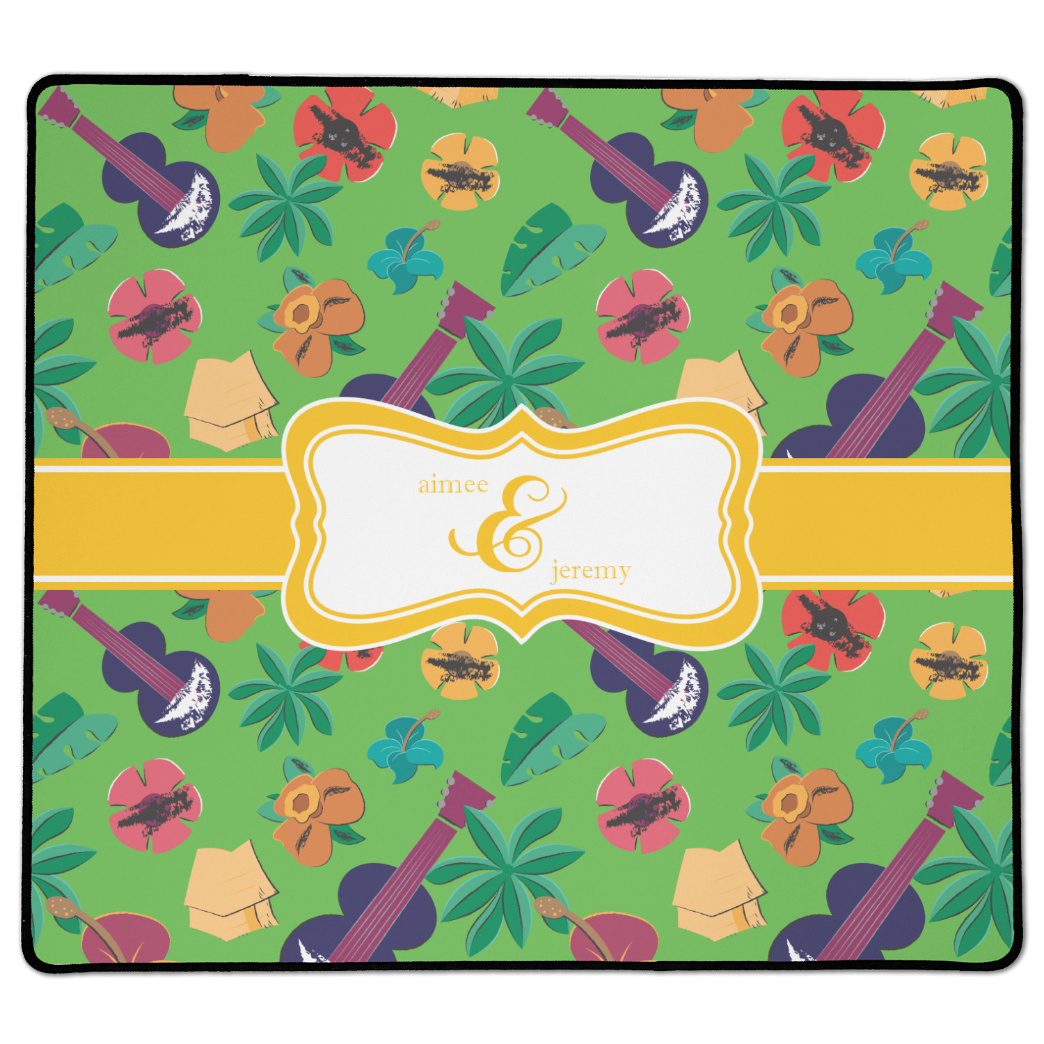 What's more classic Hawaiian than ukuleles, tiki huts, and flirty flowers? This bright design will send you straight back to better days, spent lounging on a beach in some tropical paradise.