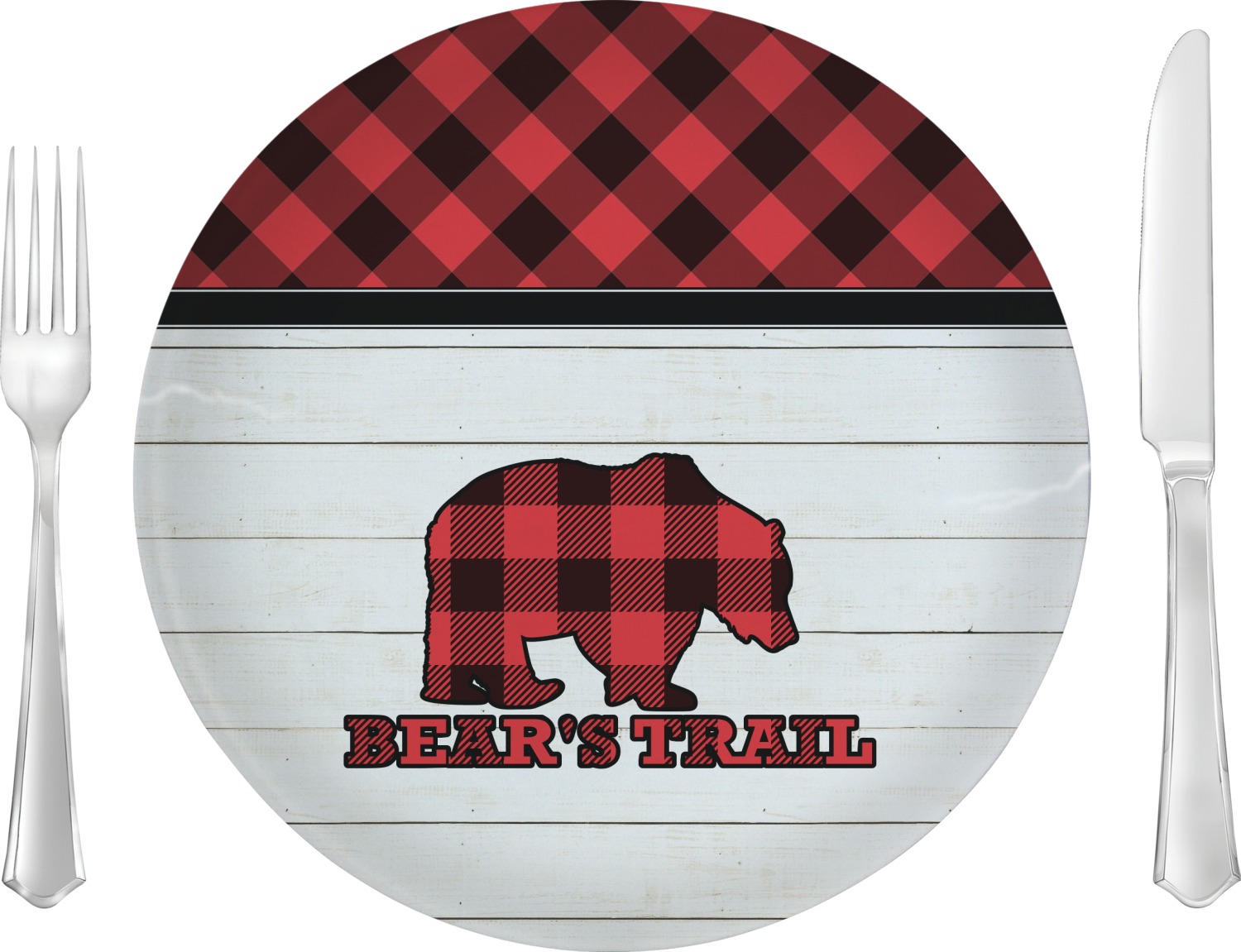The main design is split into two asymmetrical sections. The top section is a diagonal red and black plaid, while the bottom is a light wood texture. On top of the wood texture is where your graphic and personalization go! The bear graphic and text below are filled with another black and red plaid.