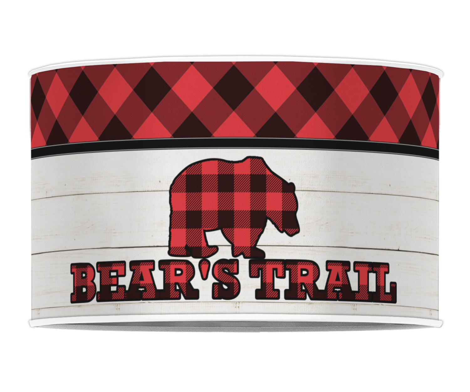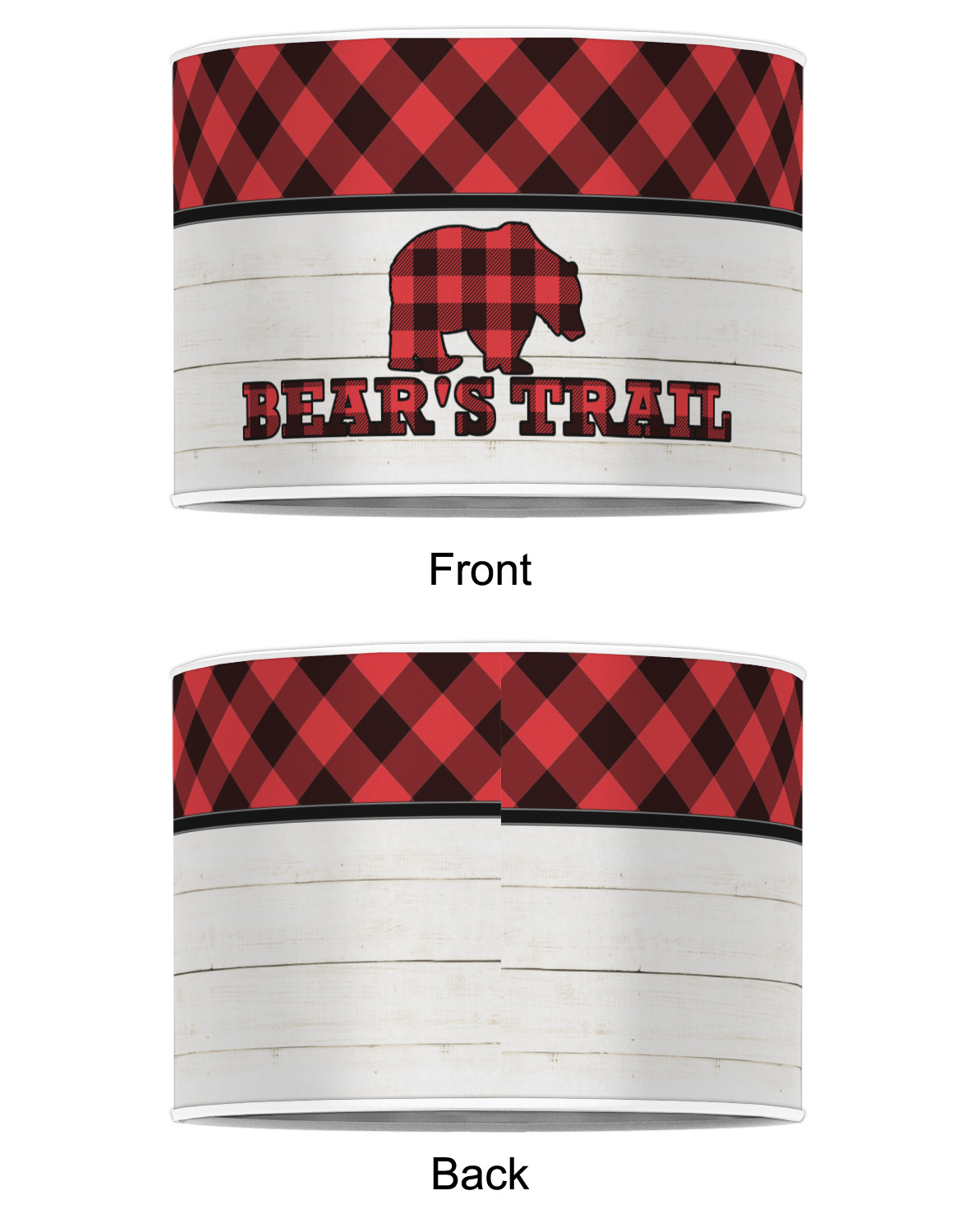 The main design is split into two asymmetrical sections. The top section is a diagonal red and black plaid, while the bottom is a light wood texture. On top of the wood texture is where your graphic and personalization go! The bear graphic and text below are filled with another black and red plaid.