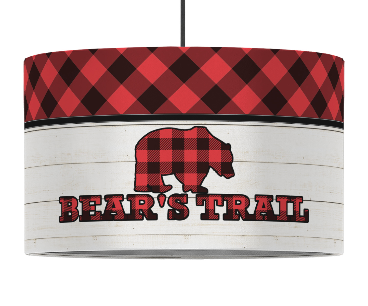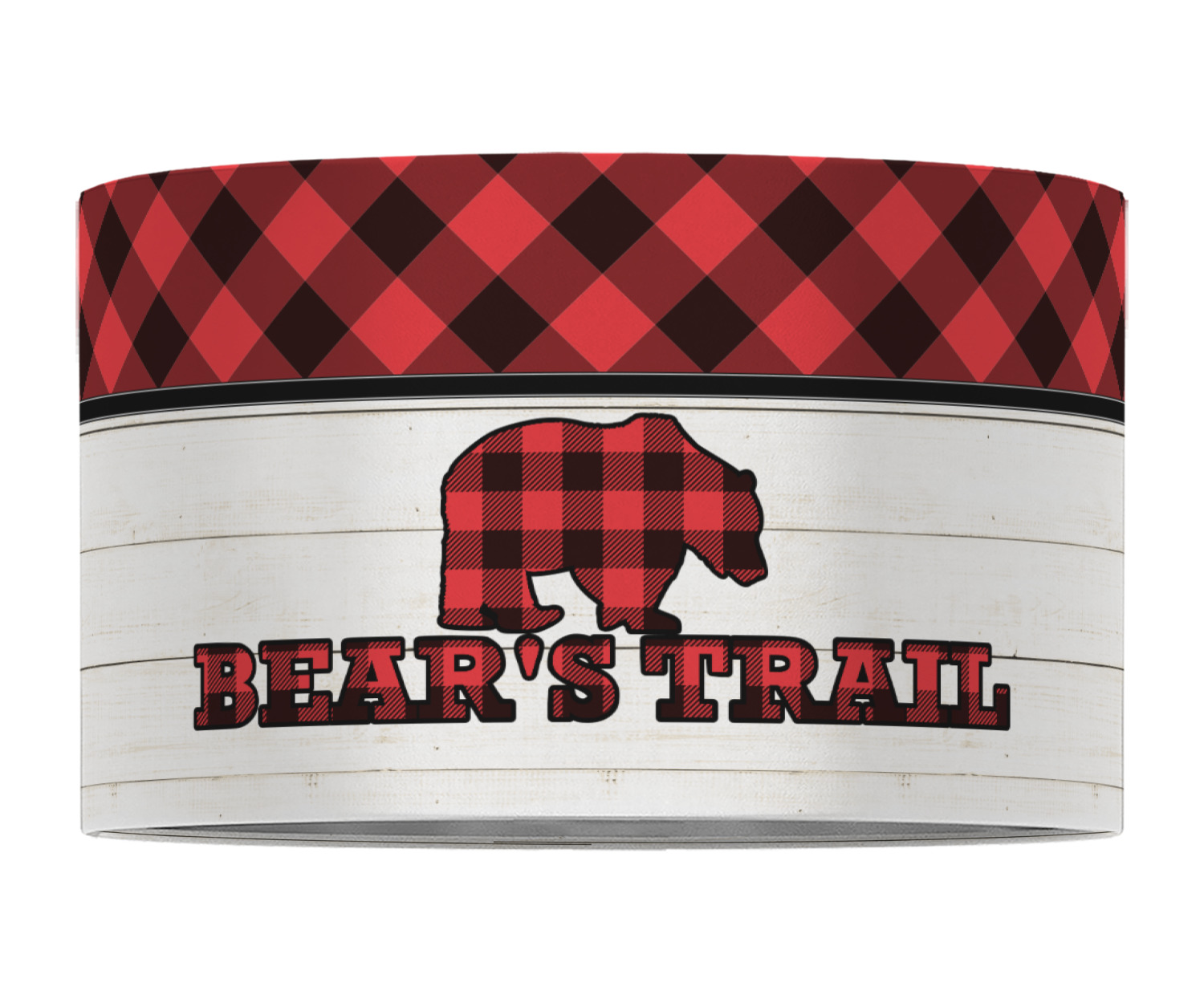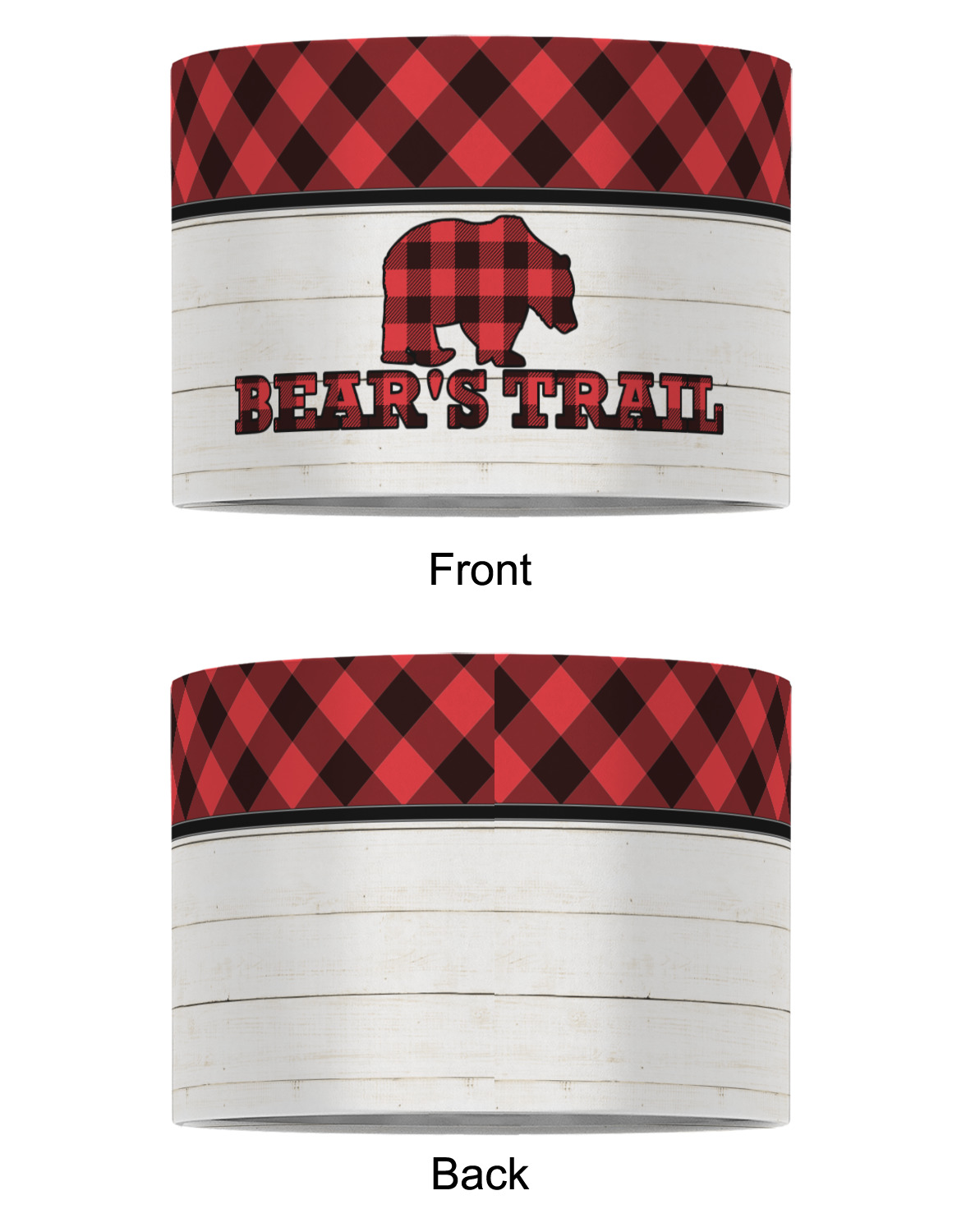 The main design is split into two asymmetrical sections. The top section is a diagonal red and black plaid, while the bottom is a light wood texture. On top of the wood texture is where your graphic and personalization go! The bear graphic and text below are filled with another black and red plaid.