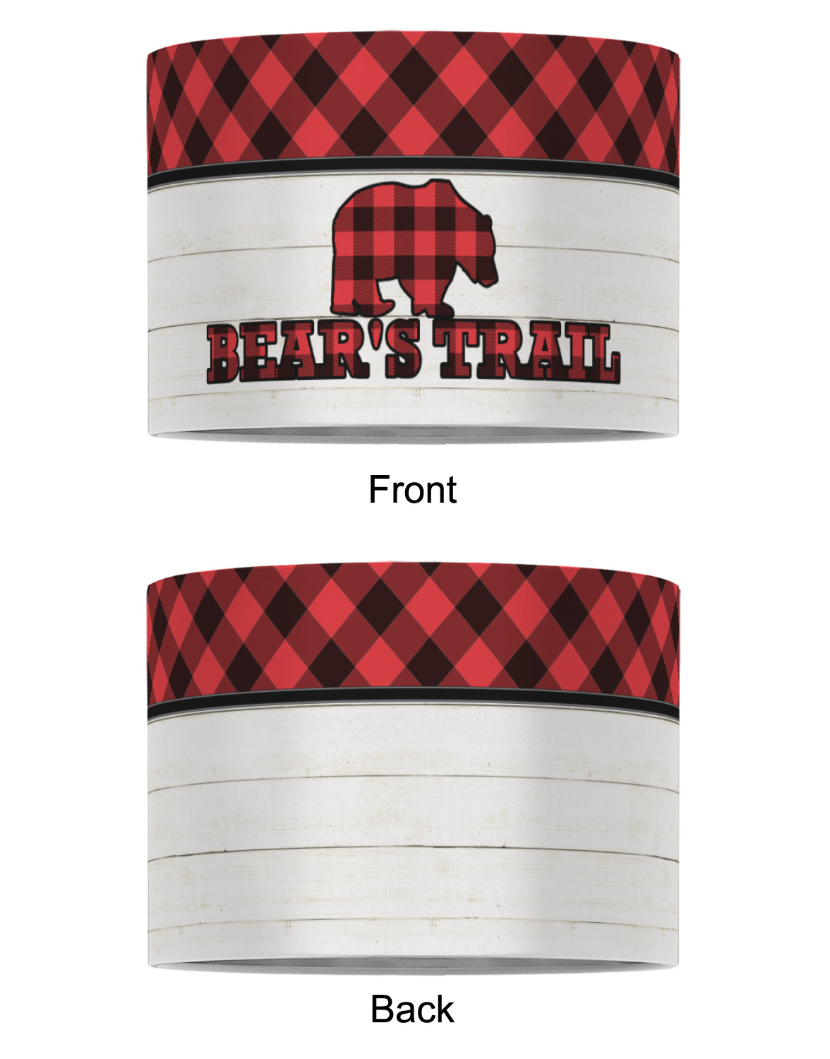 The main design is split into two asymmetrical sections. The top section is a diagonal red and black plaid, while the bottom is a light wood texture. On top of the wood texture is where your graphic and personalization go! The bear graphic and text below are filled with another black and red plaid.