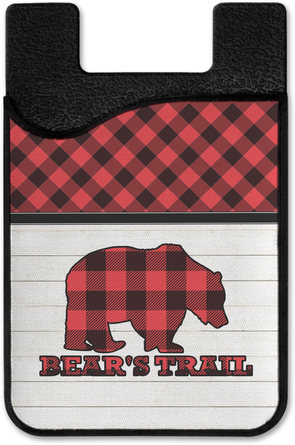 The main design is split into two asymmetrical sections. The top section is a diagonal red and black plaid, while the bottom is a light wood texture. On top of the wood texture is where your graphic and personalization go! The bear graphic and text below are filled with another black and red plaid.