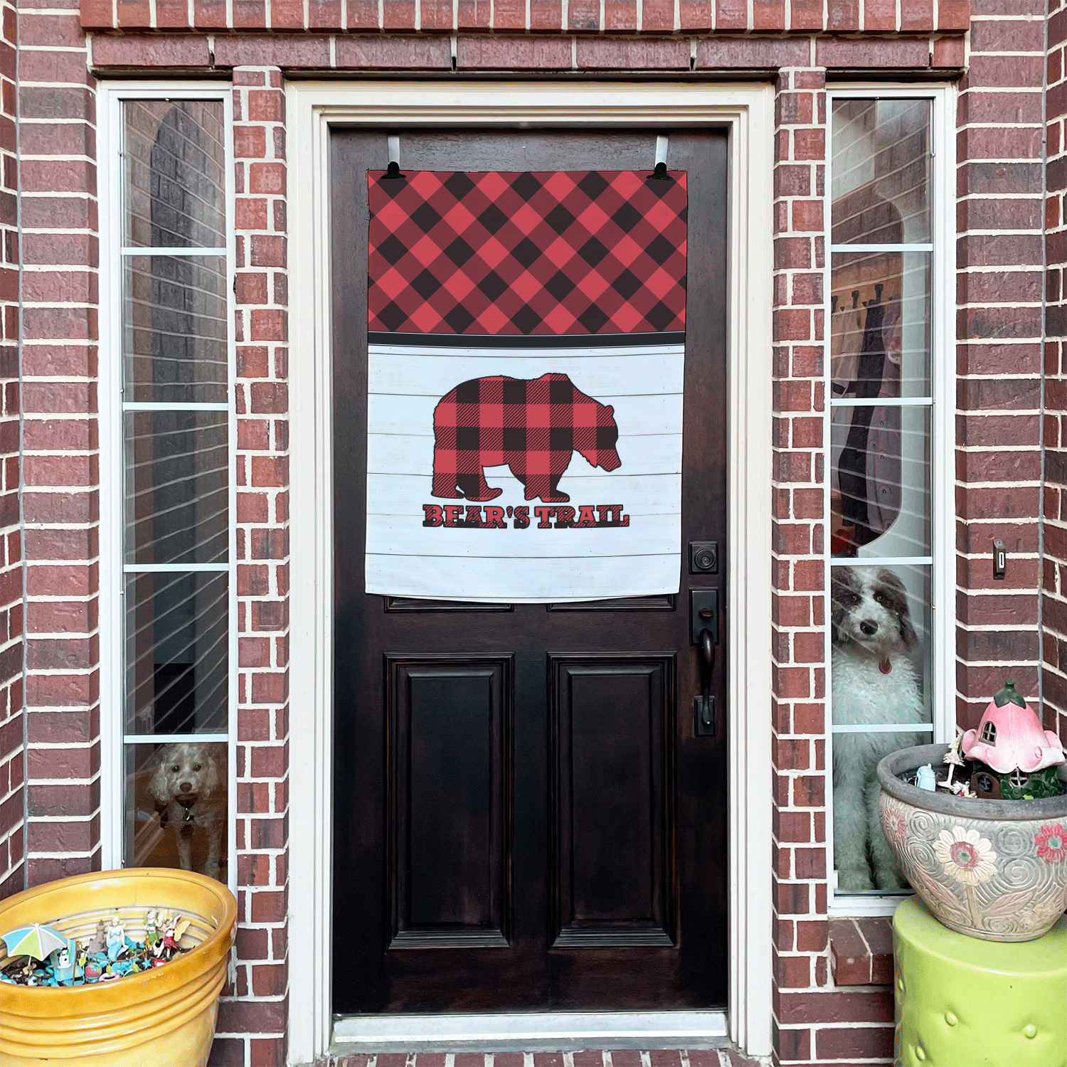 The main design is split into two asymmetrical sections. The top section is a diagonal red and black plaid, while the bottom is a light wood texture. On top of the wood texture is where your graphic and personalization go! The bear graphic and text below are filled with another black and red plaid.