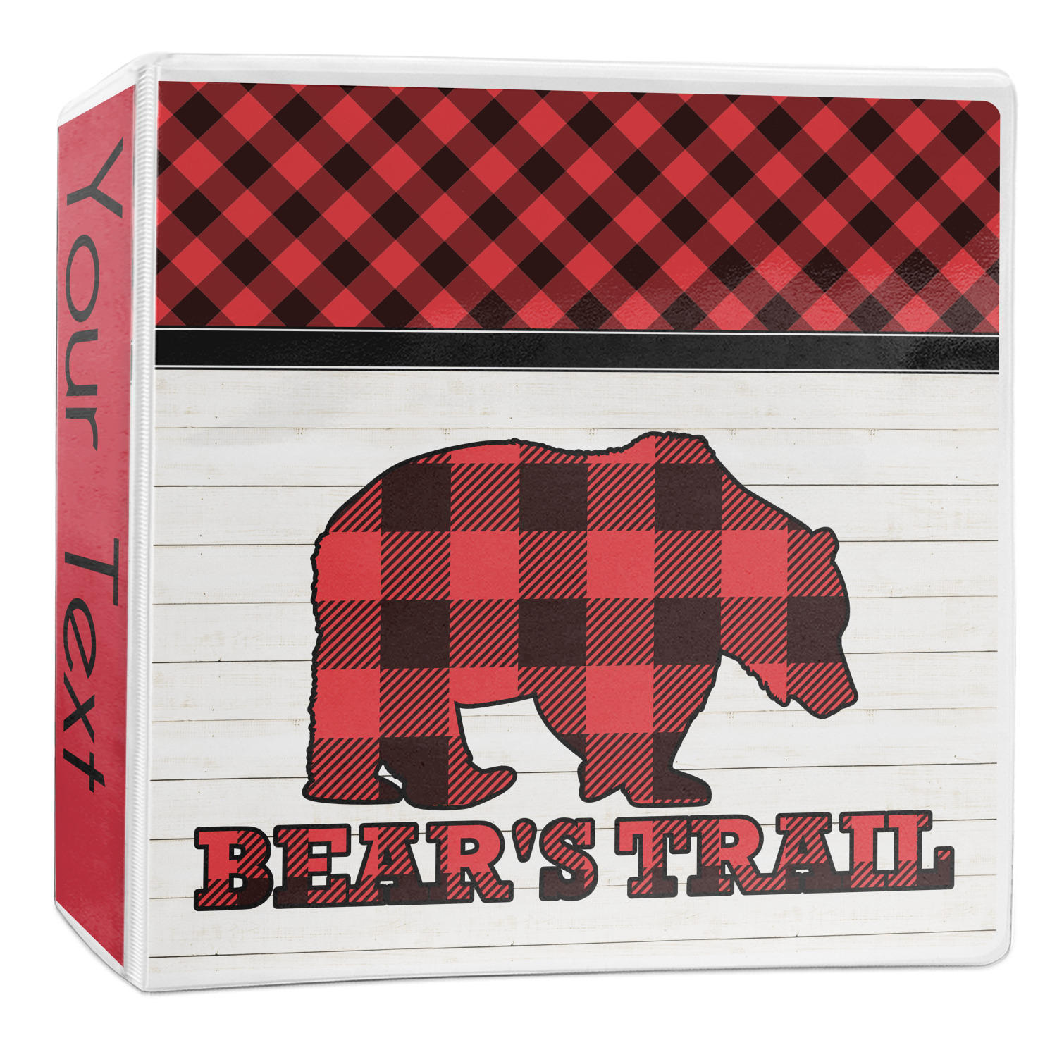 The main design is split into two asymmetrical sections. The top section is a diagonal red and black plaid, while the bottom is a light wood texture. On top of the wood texture is where your graphic and personalization go! The bear graphic and text below are filled with another black and red plaid.