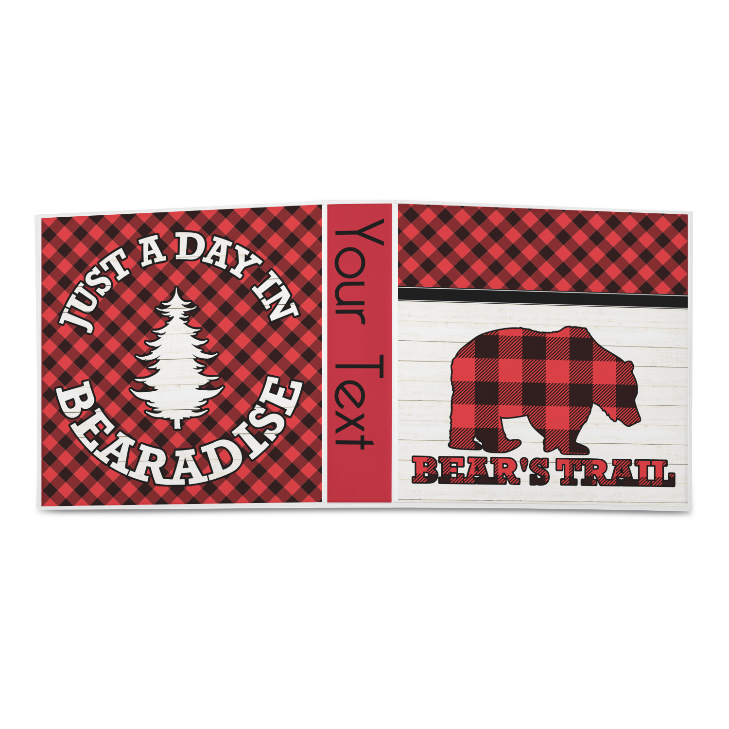 The main design is split into two asymmetrical sections. The top section is a diagonal red and black plaid, while the bottom is a light wood texture. On top of the wood texture is where your graphic and personalization go! The bear graphic and text below are filled with another black and red plaid.