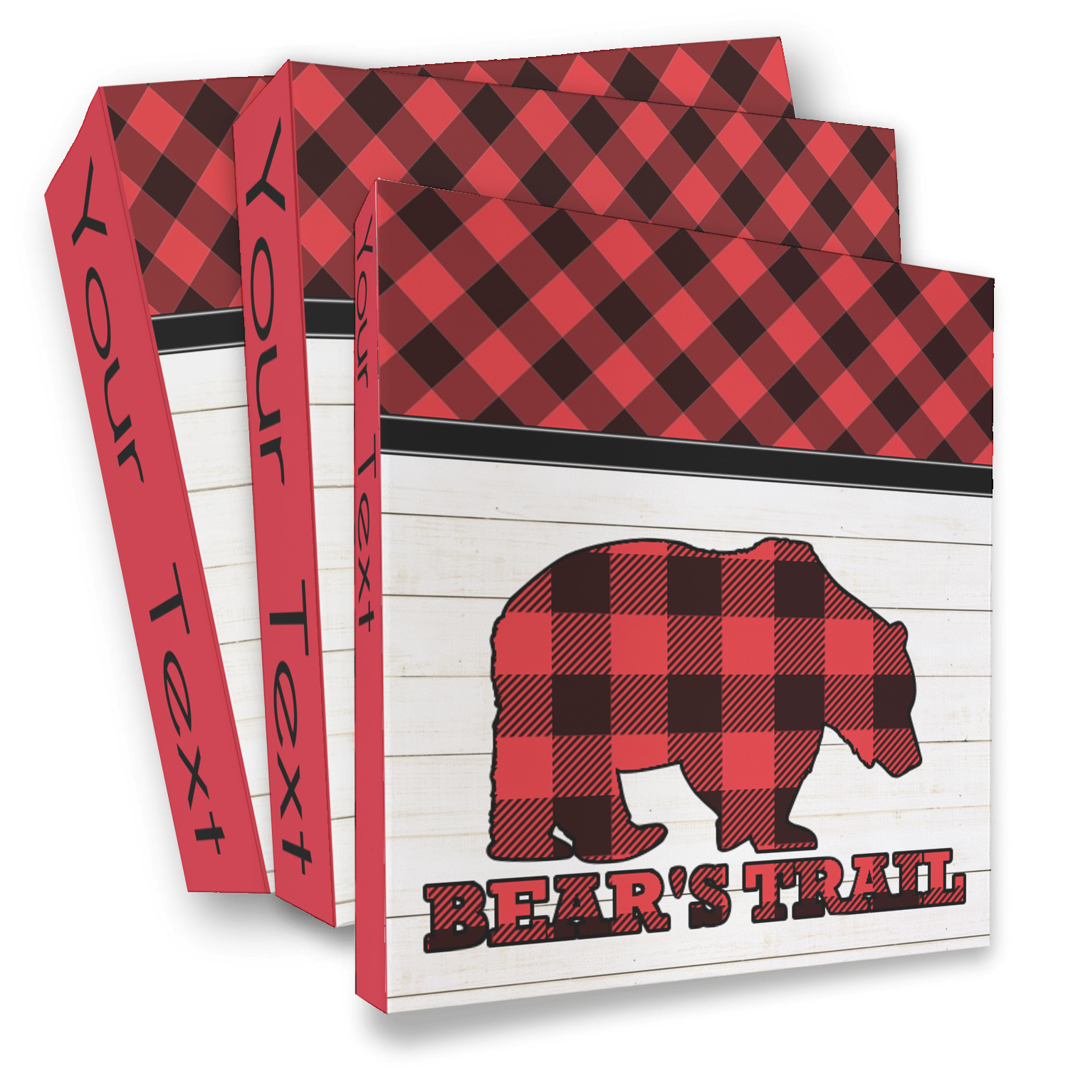 The main design is split into two asymmetrical sections. The top section is a diagonal red and black plaid, while the bottom is a light wood texture. On top of the wood texture is where your graphic and personalization go! The bear graphic and text below are filled with another black and red plaid.