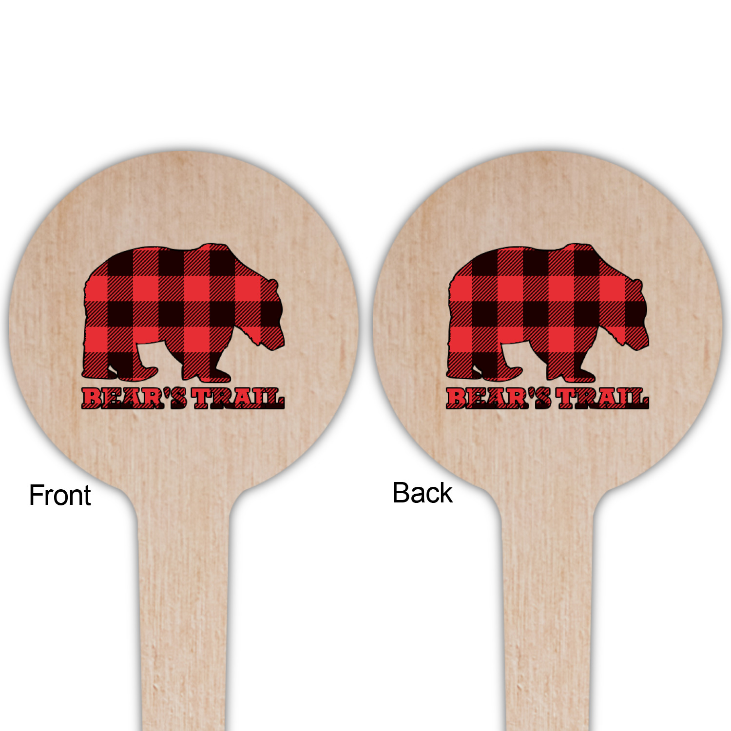 The main design is split into two asymmetrical sections. The top section is a diagonal red and black plaid, while the bottom is a light wood texture. On top of the wood texture is where your graphic and personalization go! The bear graphic and text below are filled with another black and red plaid.
