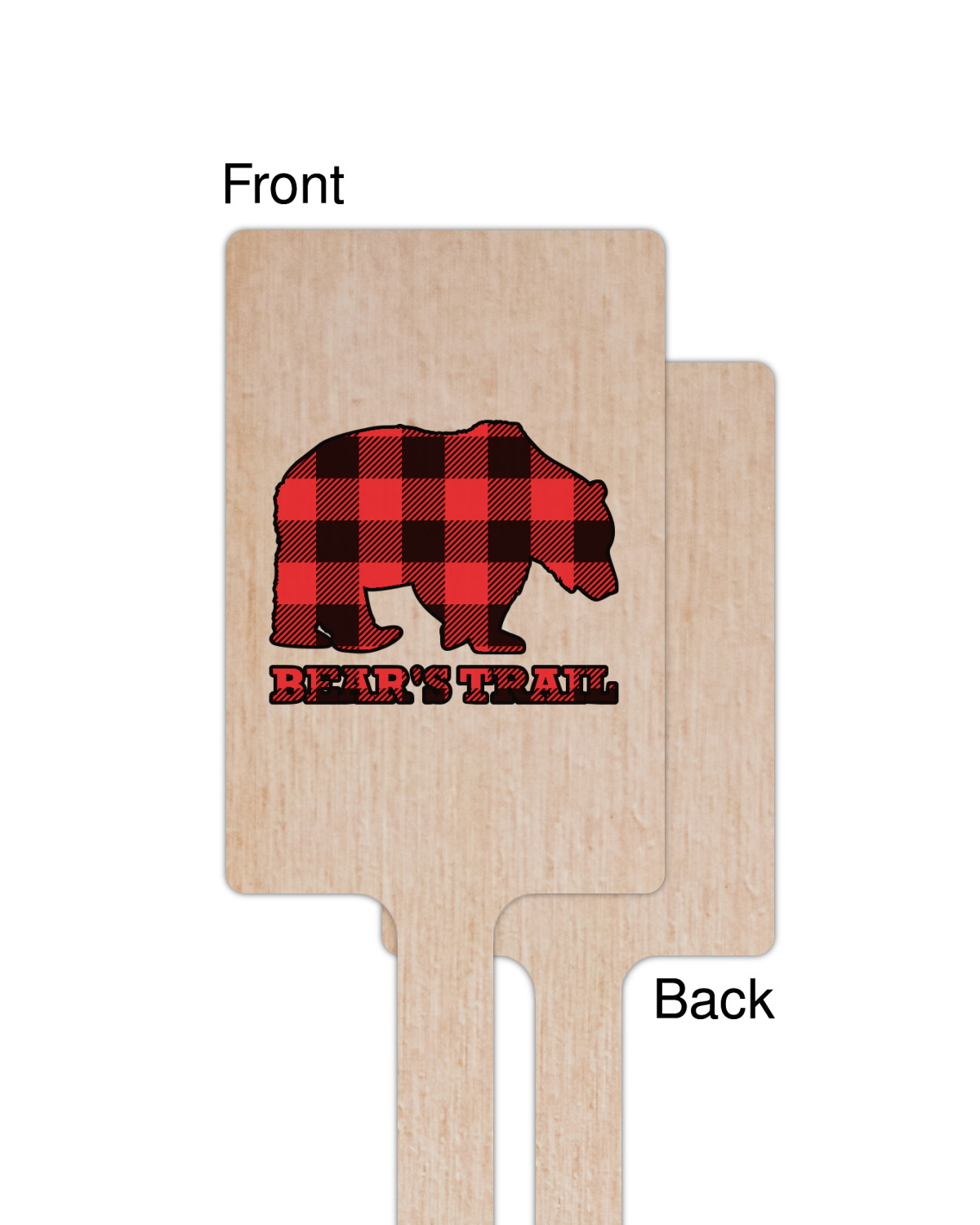 The main design is split into two asymmetrical sections. The top section is a diagonal red and black plaid, while the bottom is a light wood texture. On top of the wood texture is where your graphic and personalization go! The bear graphic and text below are filled with another black and red plaid.
