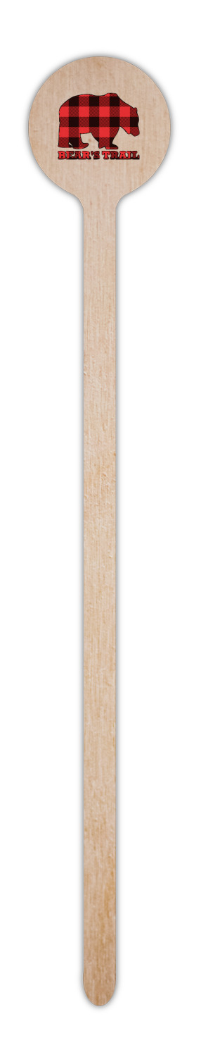 The main design is split into two asymmetrical sections. The top section is a diagonal red and black plaid, while the bottom is a light wood texture. On top of the wood texture is where your graphic and personalization go! The bear graphic and text below are filled with another black and red plaid.