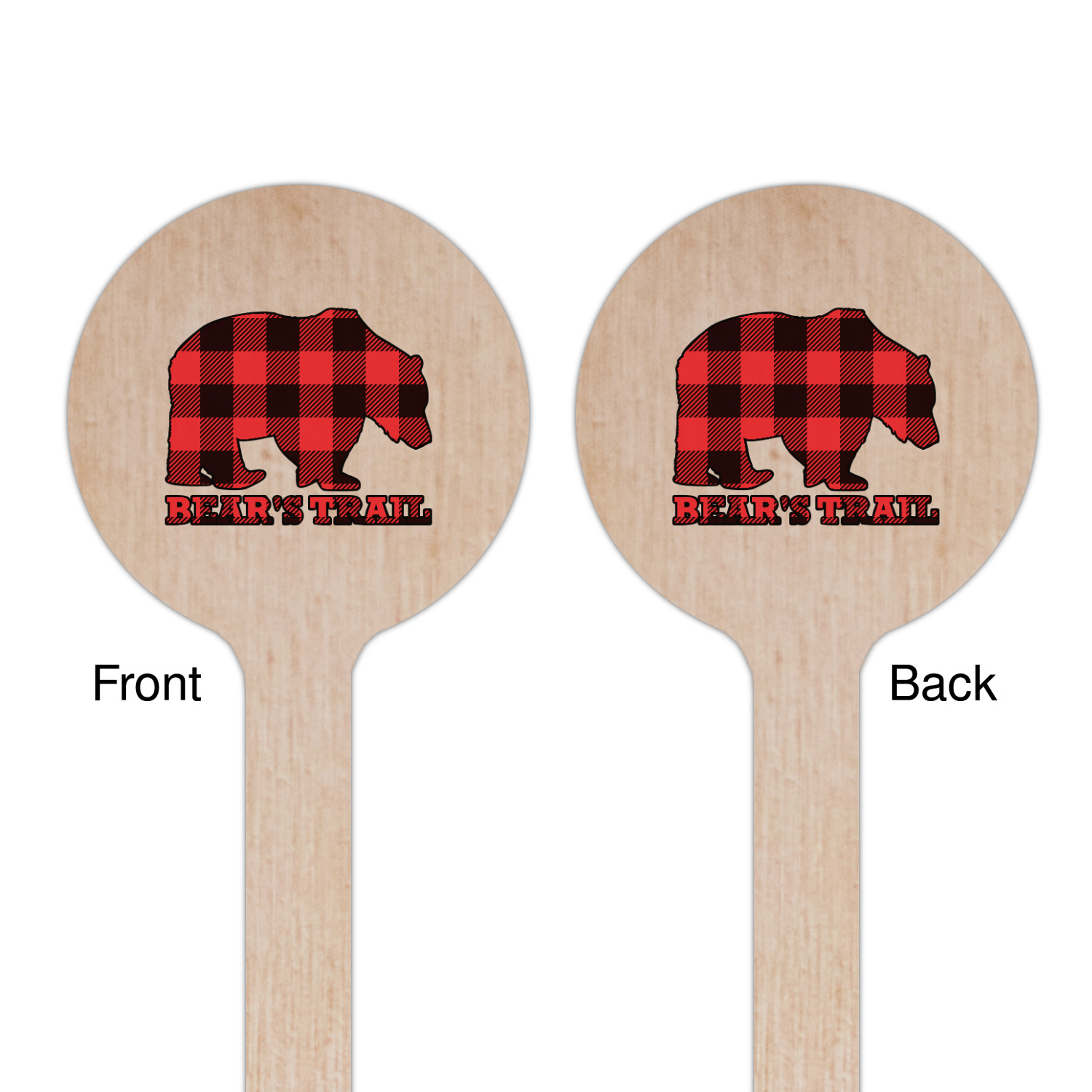 The main design is split into two asymmetrical sections. The top section is a diagonal red and black plaid, while the bottom is a light wood texture. On top of the wood texture is where your graphic and personalization go! The bear graphic and text below are filled with another black and red plaid.