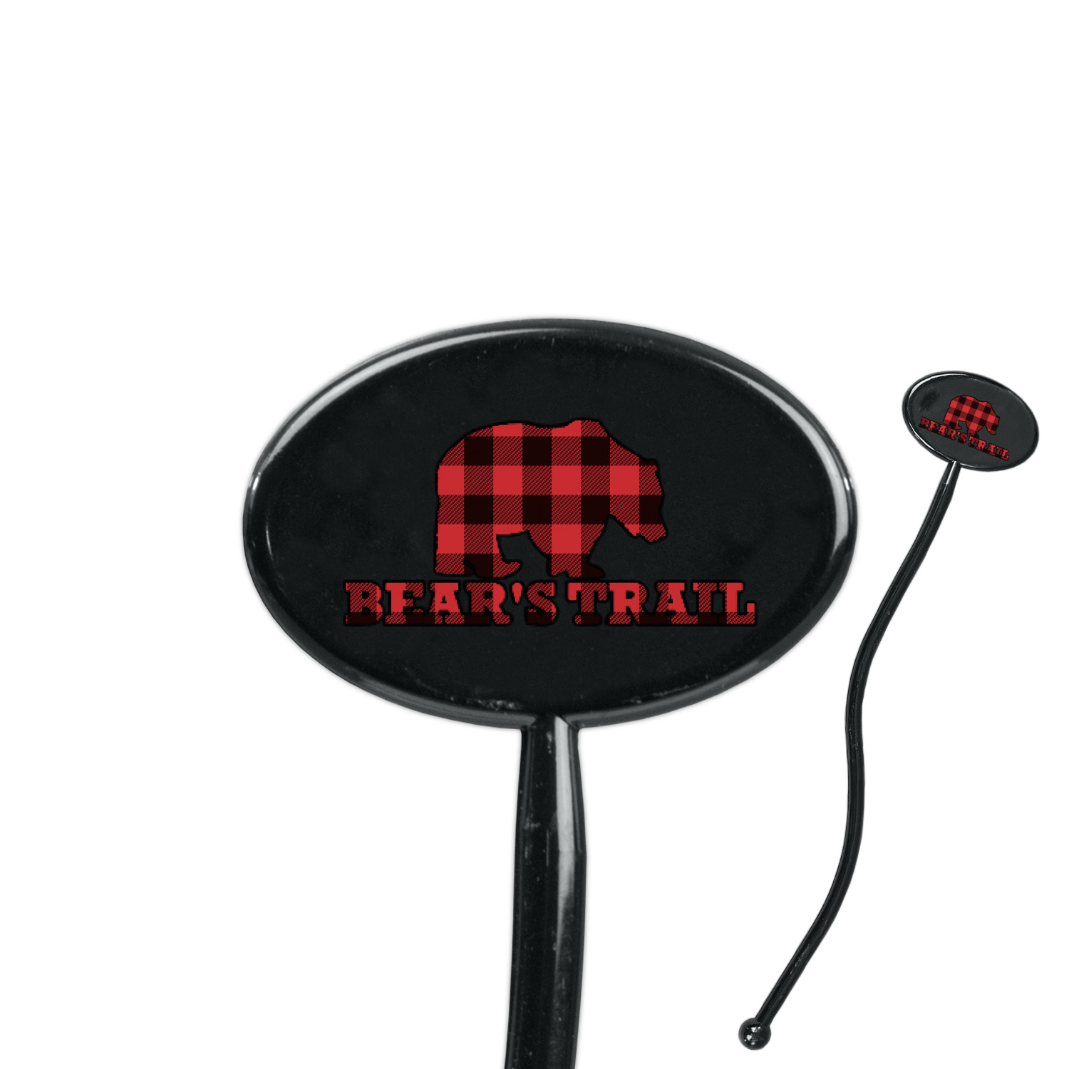 The main design is split into two asymmetrical sections. The top section is a diagonal red and black plaid, while the bottom is a light wood texture. On top of the wood texture is where your graphic and personalization go! The bear graphic and text below are filled with another black and red plaid.