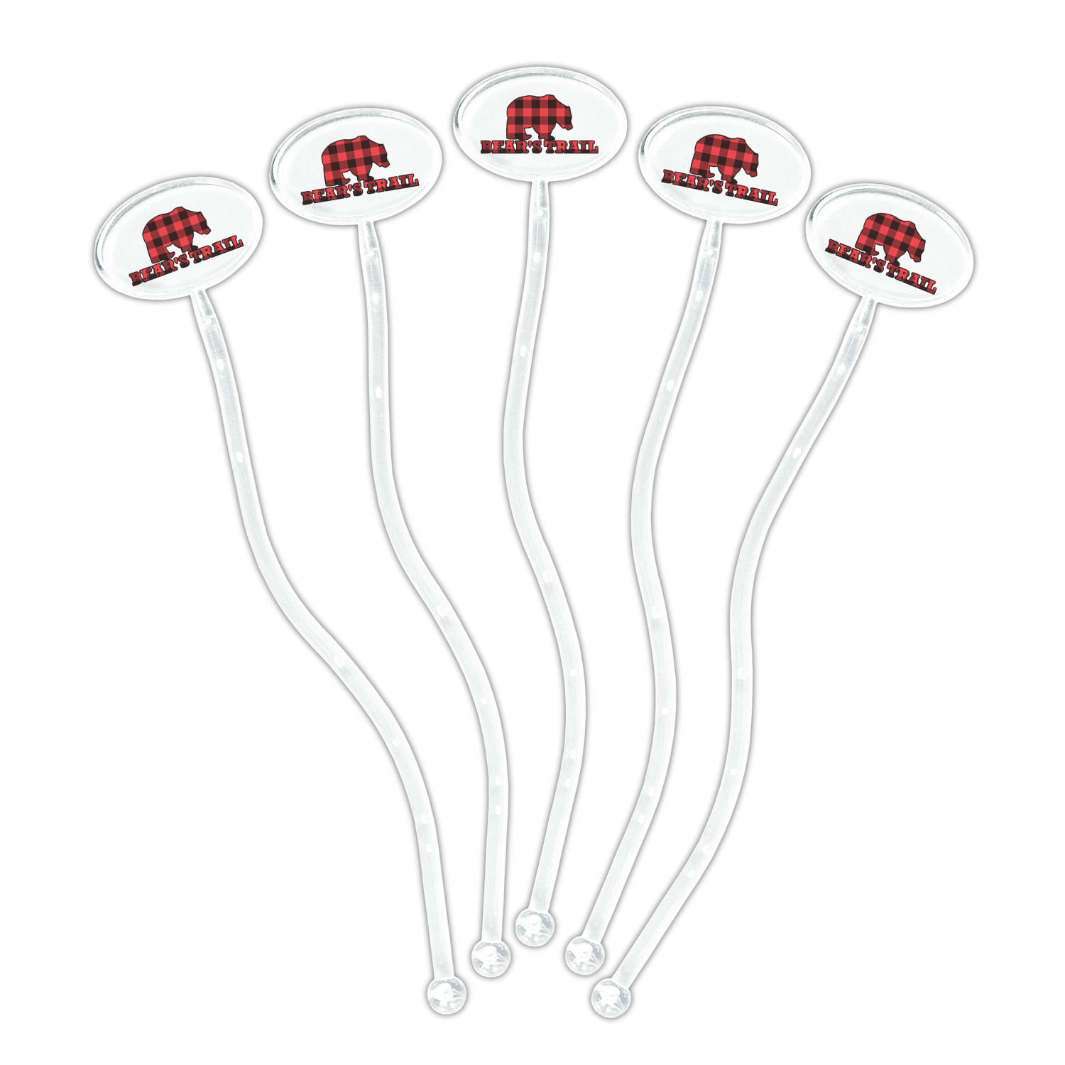 The main design is split into two asymmetrical sections. The top section is a diagonal red and black plaid, while the bottom is a light wood texture. On top of the wood texture is where your graphic and personalization go! The bear graphic and text below are filled with another black and red plaid.