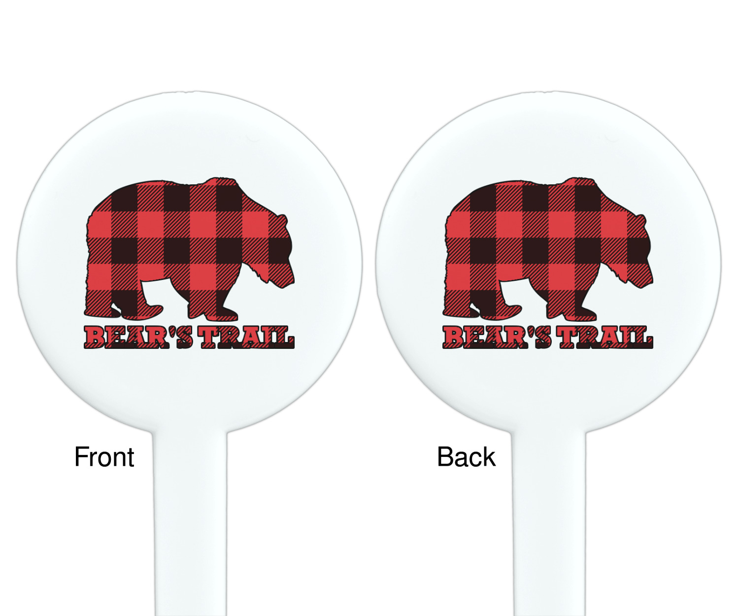 The main design is split into two asymmetrical sections. The top section is a diagonal red and black plaid, while the bottom is a light wood texture. On top of the wood texture is where your graphic and personalization go! The bear graphic and text below are filled with another black and red plaid.