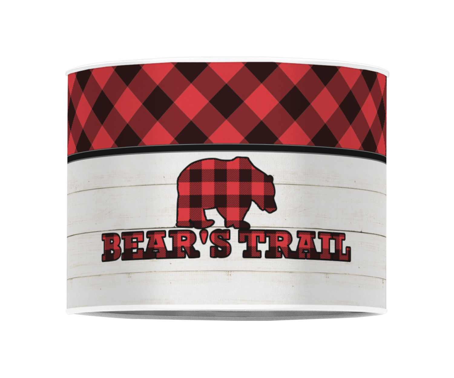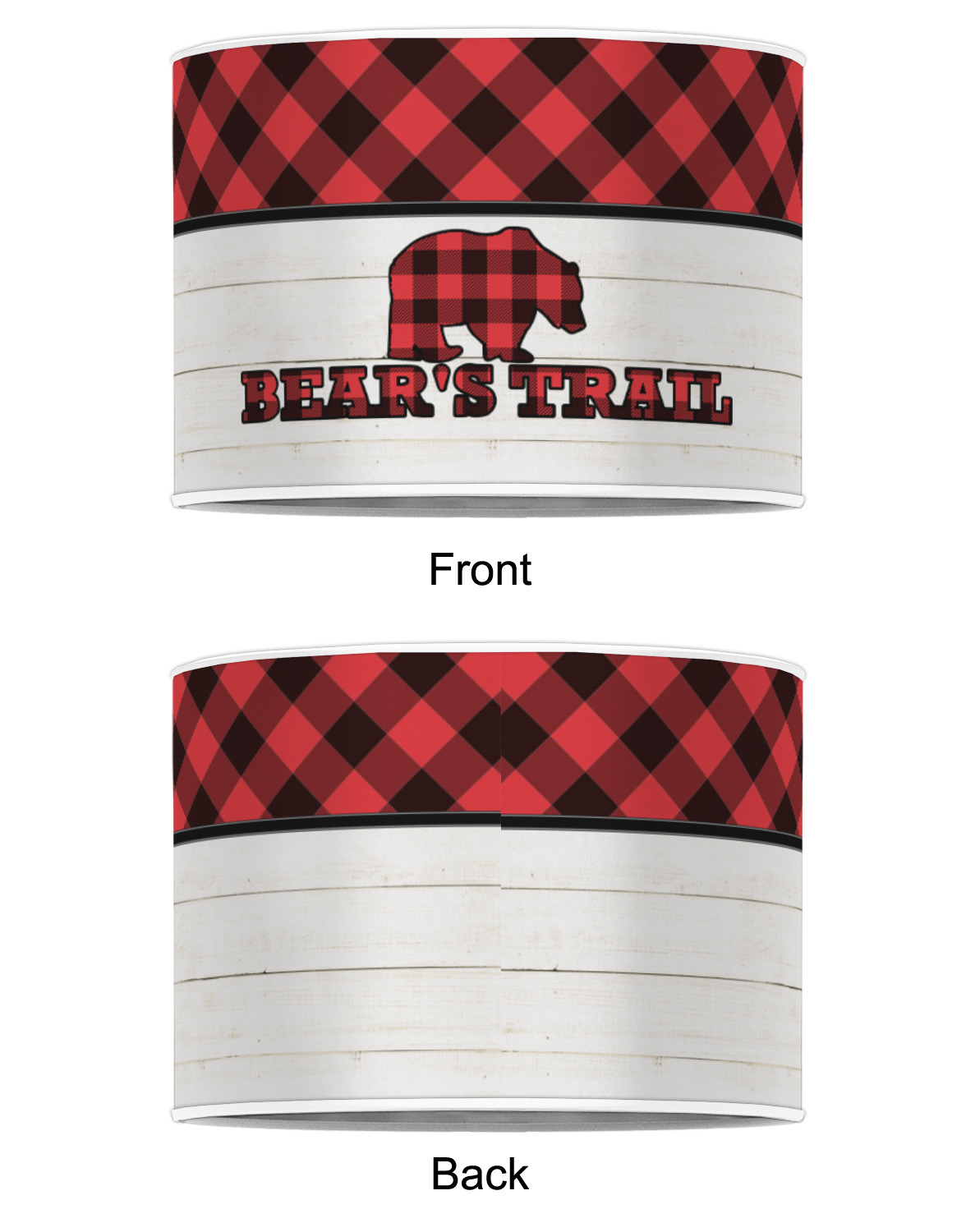 The main design is split into two asymmetrical sections. The top section is a diagonal red and black plaid, while the bottom is a light wood texture. On top of the wood texture is where your graphic and personalization go! The bear graphic and text below are filled with another black and red plaid.