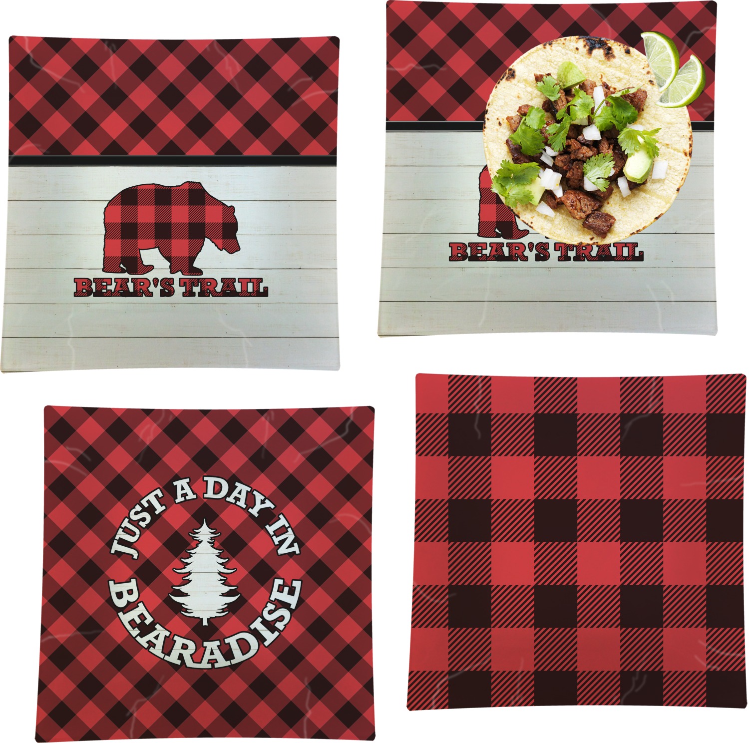 The main design is split into two asymmetrical sections. The top section is a diagonal red and black plaid, while the bottom is a light wood texture. On top of the wood texture is where your graphic and personalization go! The bear graphic and text below are filled with another black and red plaid.