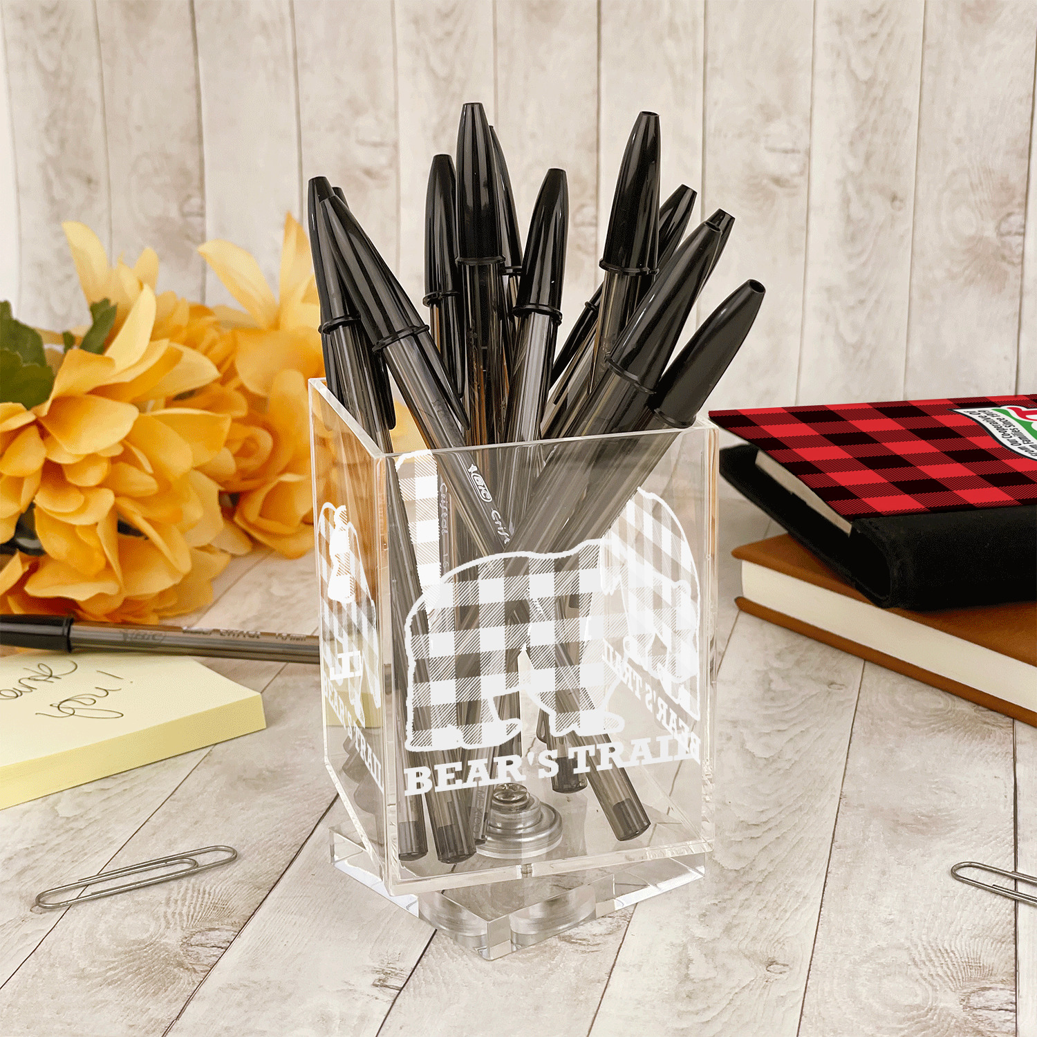 Add a great accessory to your desk with one of these acrylic pen holders. A great way to store your writing utensils, and personalized to suit your needs.
