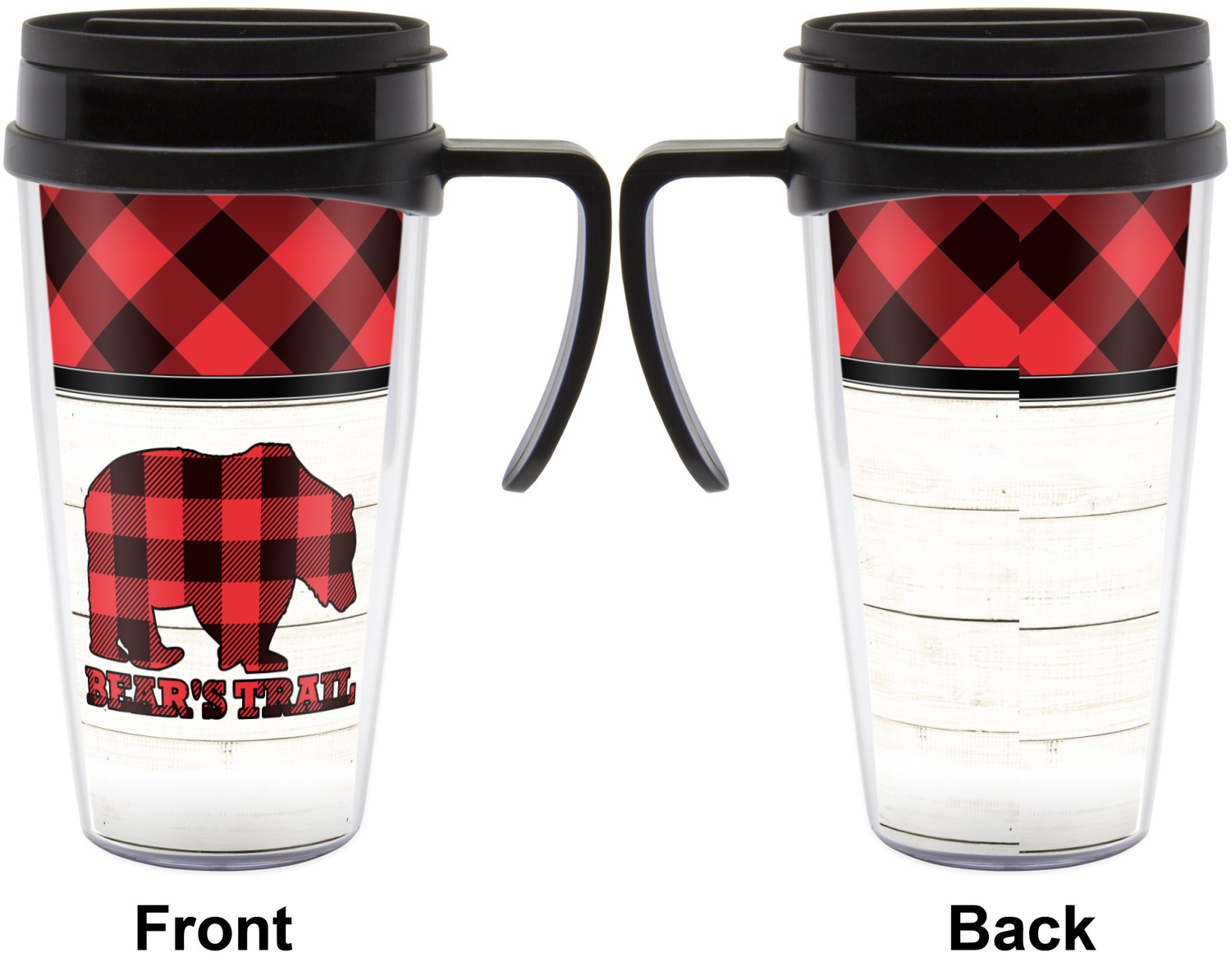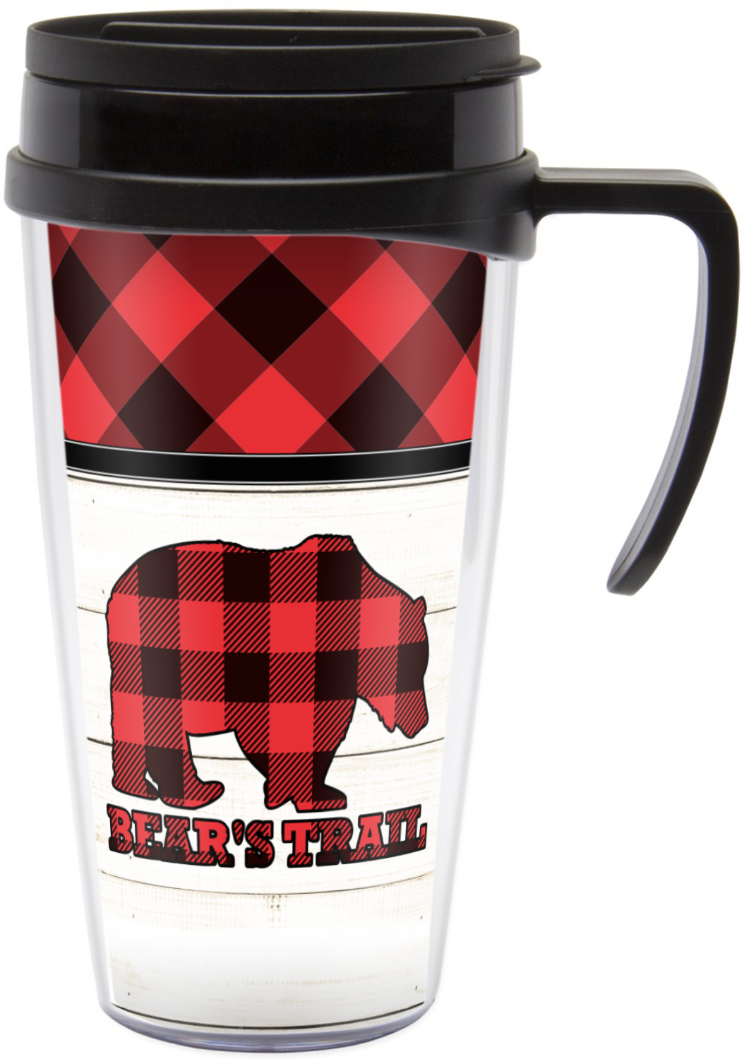 The main design is split into two asymmetrical sections. The top section is a diagonal red and black plaid, while the bottom is a light wood texture. On top of the wood texture is where your graphic and personalization go! The bear graphic and text below are filled with another black and red plaid.