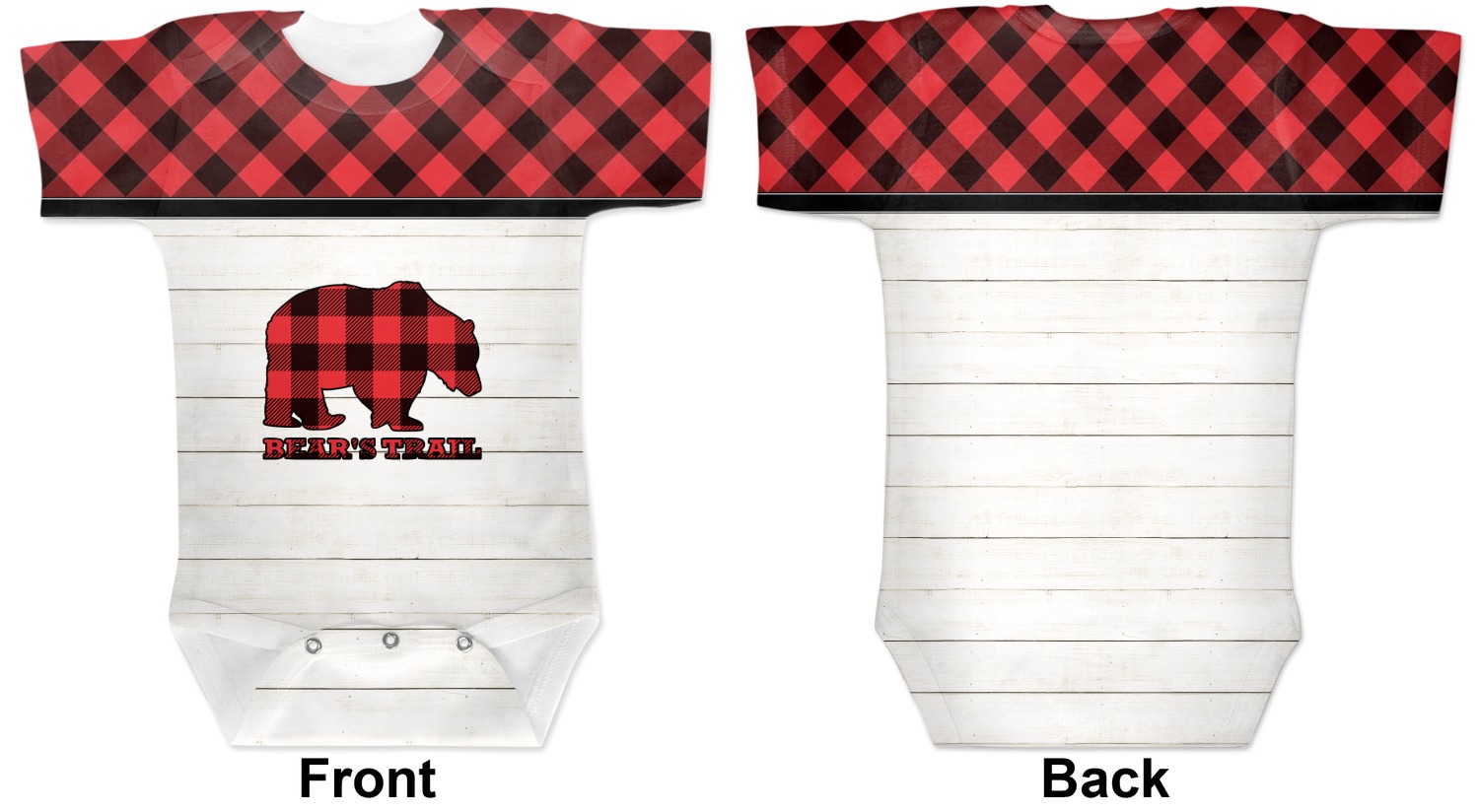 The main design is split into two asymmetrical sections. The top section is a diagonal red and black plaid, while the bottom is a light wood texture. On top of the wood texture is where your graphic and personalization go! The bear graphic and text below are filled with another black and red plaid.