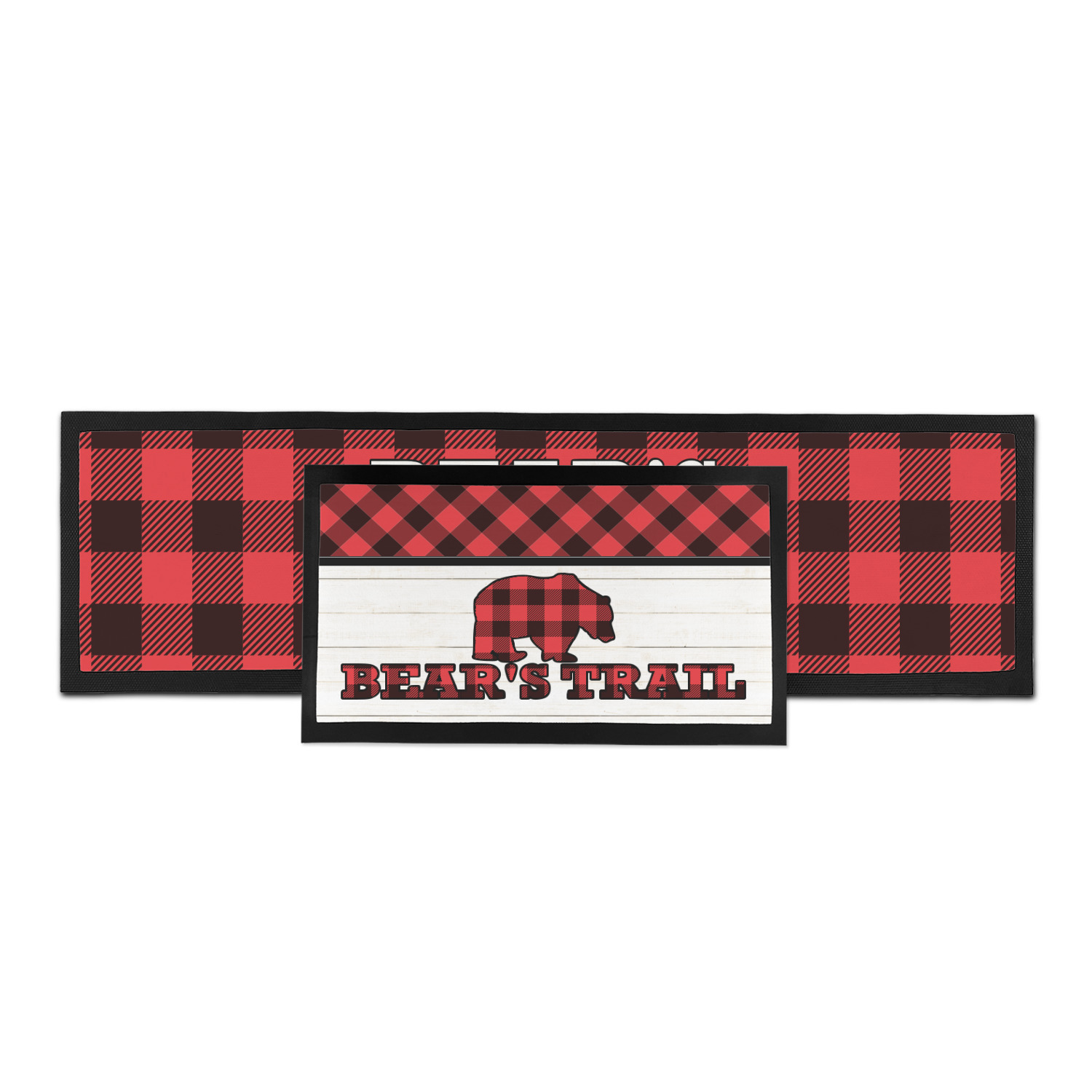 The main design is split into two asymmetrical sections. The top section is a diagonal red and black plaid, while the bottom is a light wood texture. On top of the wood texture is where your graphic and personalization go! The bear graphic and text below are filled with another black and red plaid.