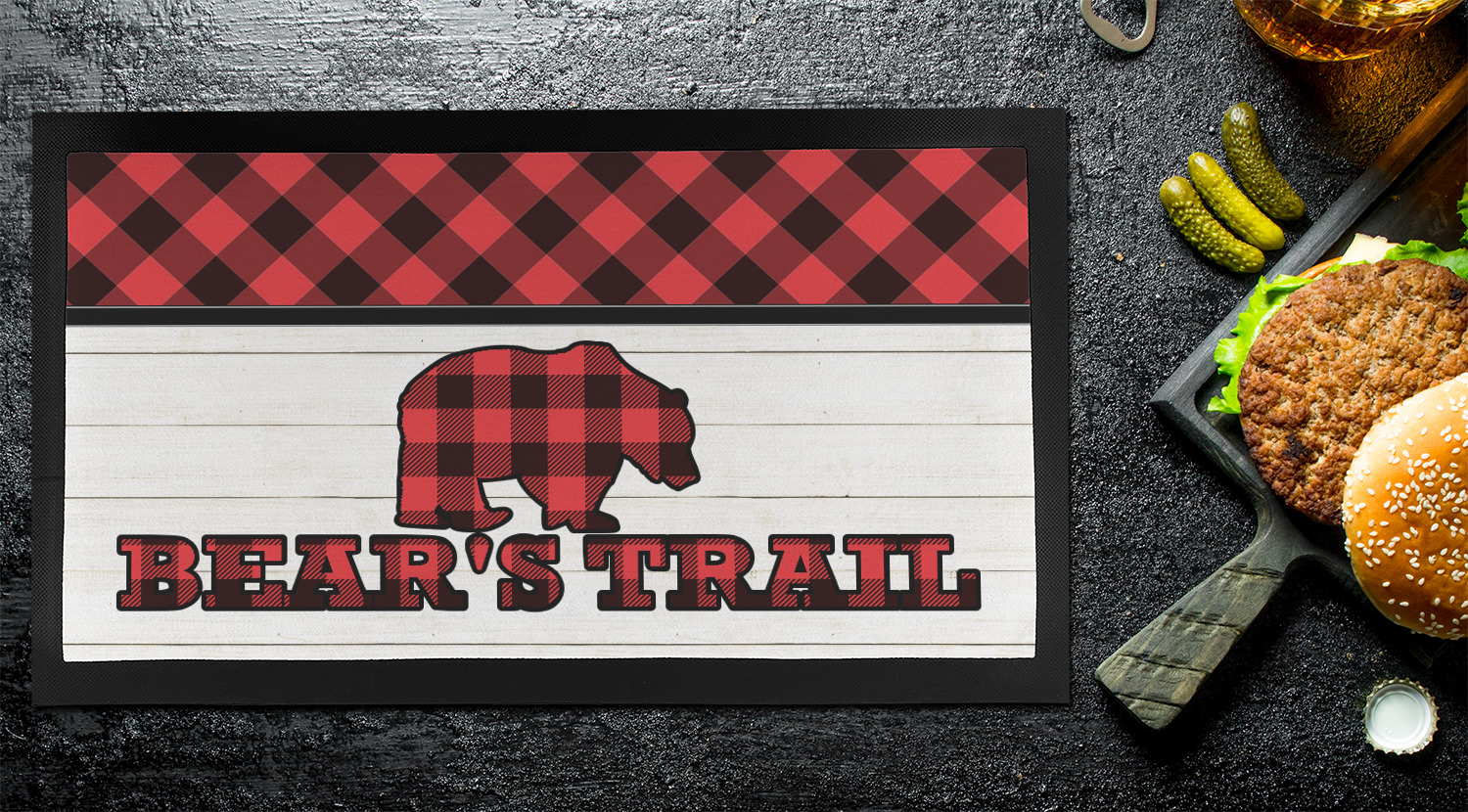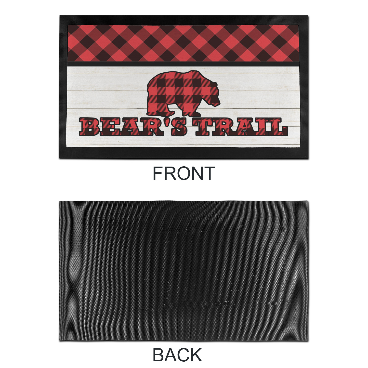 The main design is split into two asymmetrical sections. The top section is a diagonal red and black plaid, while the bottom is a light wood texture. On top of the wood texture is where your graphic and personalization go! The bear graphic and text below are filled with another black and red plaid.