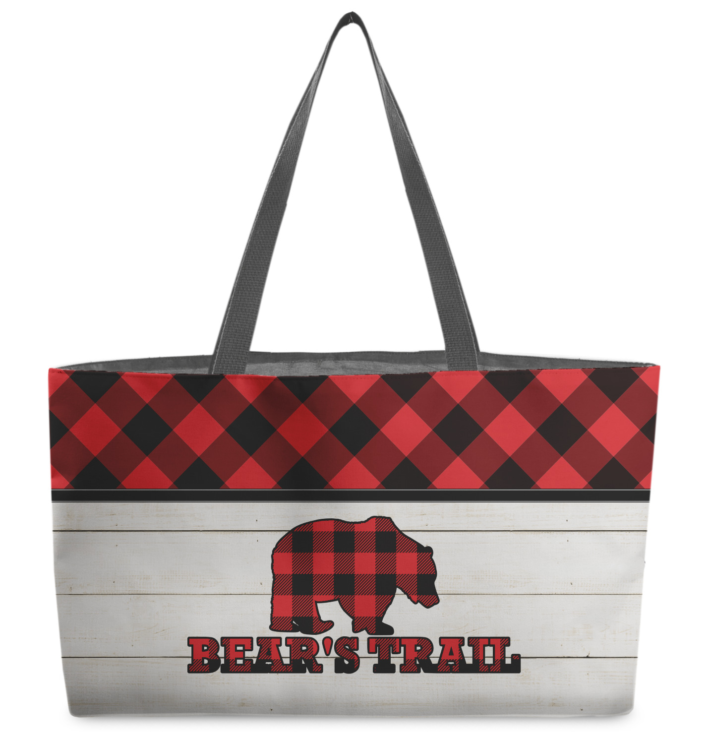 The main design is split into two asymmetrical sections. The top section is a diagonal red and black plaid, while the bottom is a light wood texture. On top of the wood texture is where your graphic and personalization go! The bear graphic and text below are filled with another black and red plaid.