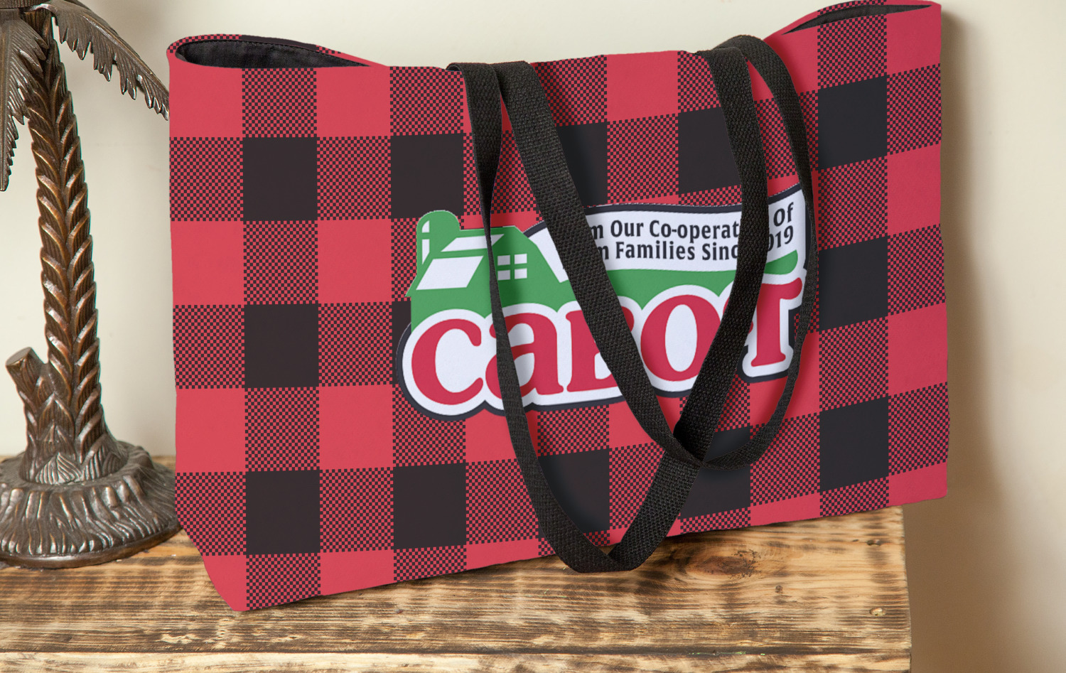 The main design is split into two asymmetrical sections. The top section is a diagonal red and black plaid, while the bottom is a light wood texture. On top of the wood texture is where your graphic and personalization go! The bear graphic and text below are filled with another black and red plaid.