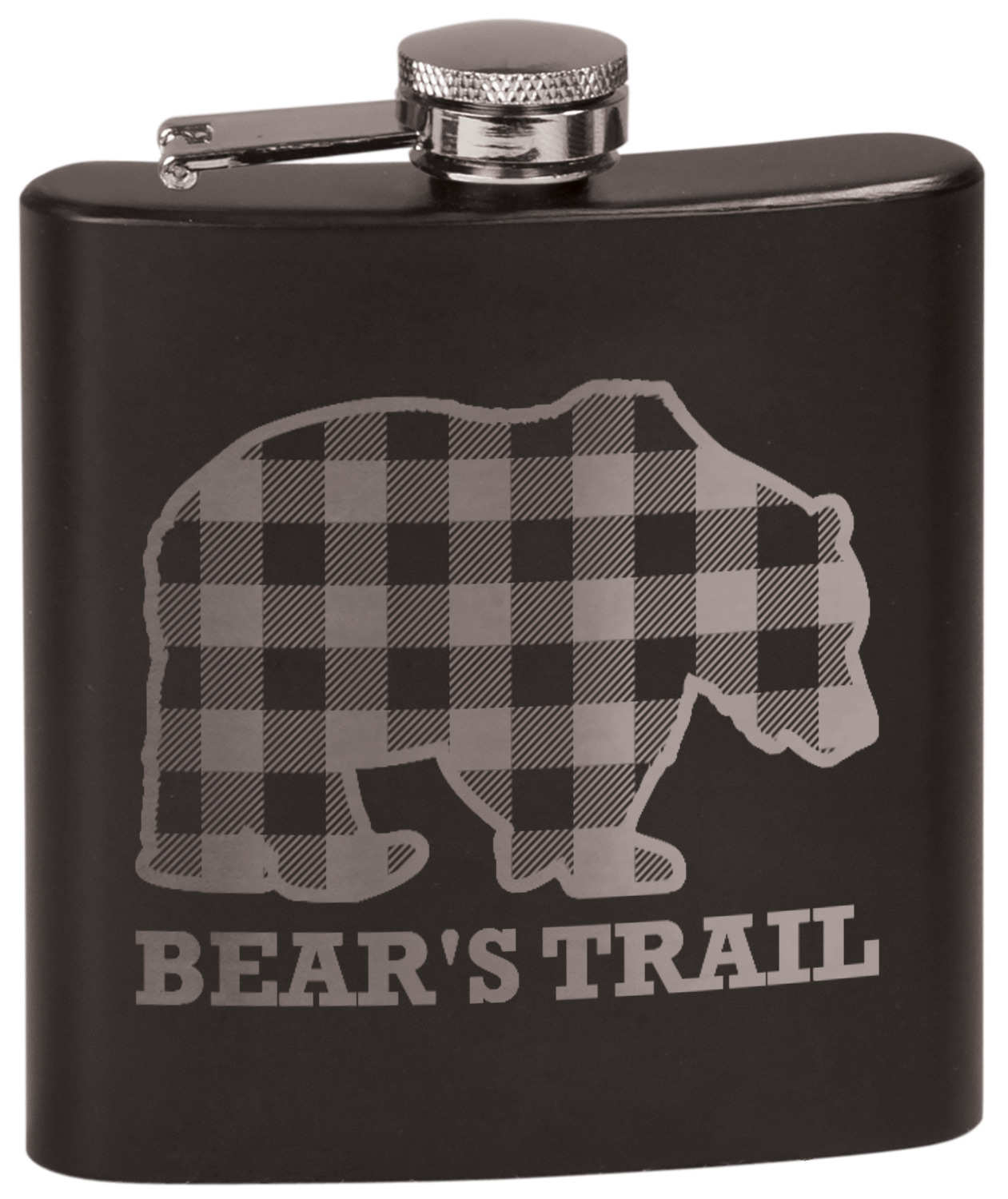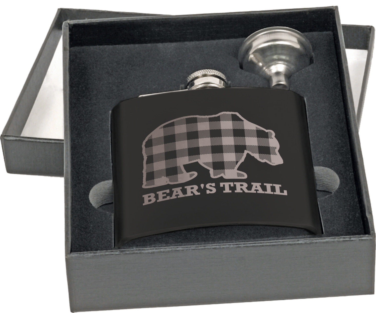 Built from a stainless steel and then covered with a black coating, this hip flask, has a very classy appearance. Similar to the standard flask, this stainless steel flask has the traditional curved shape for a snug fit in your palm. This flask set also includes a traditional screw and flip lid and liquid funnel in a gift box. At 4 by 4.5 inches, this flask can hold up to 6 ounces. Your personalized design is laser-engraved across the front of this flask.