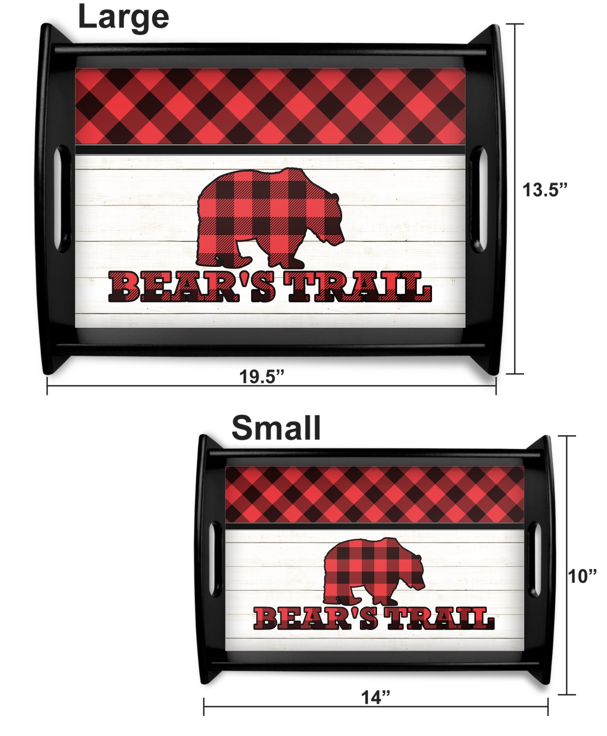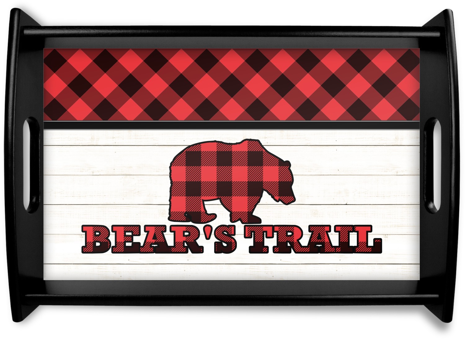 The main design is split into two asymmetrical sections. The top section is a diagonal red and black plaid, while the bottom is a light wood texture. On top of the wood texture is where your graphic and personalization go! The bear graphic and text below are filled with another black and red plaid.