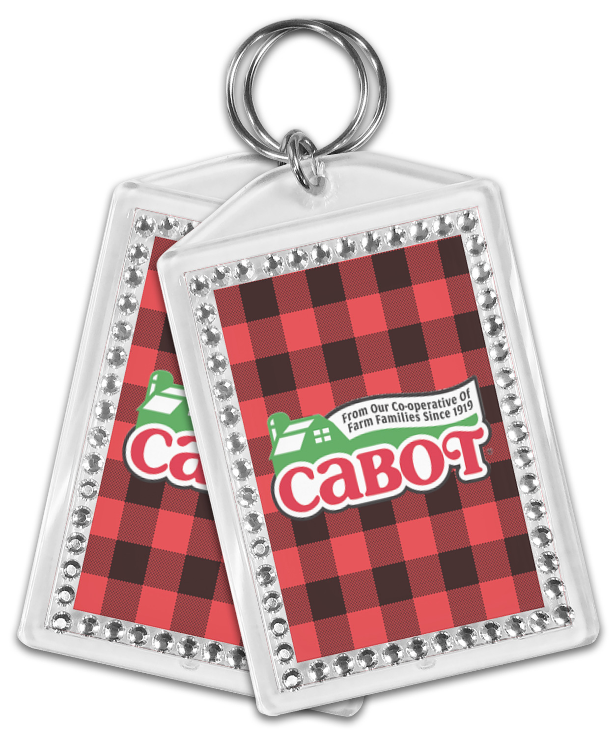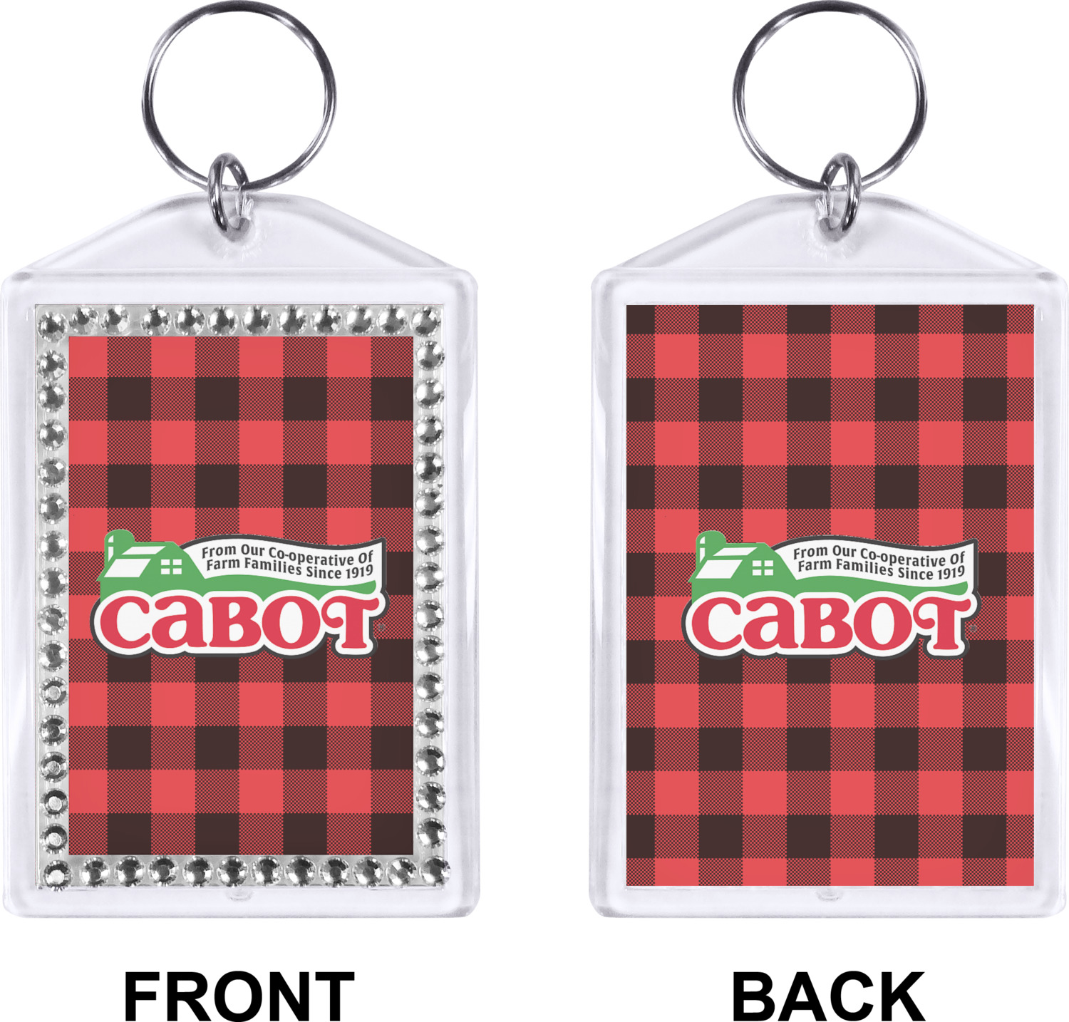 Our personalized keychains have a bold, rectangular shape, outlined by a series of shimmering rhinestones. A metal, split keyring is included with your purchase, and an additional metal hoop allows for attachment of the keychain to the split ring. This unique keychain measures at about 3.75 by 2.5 inches. We print your customized design(s) across both the back and front of this keychain.