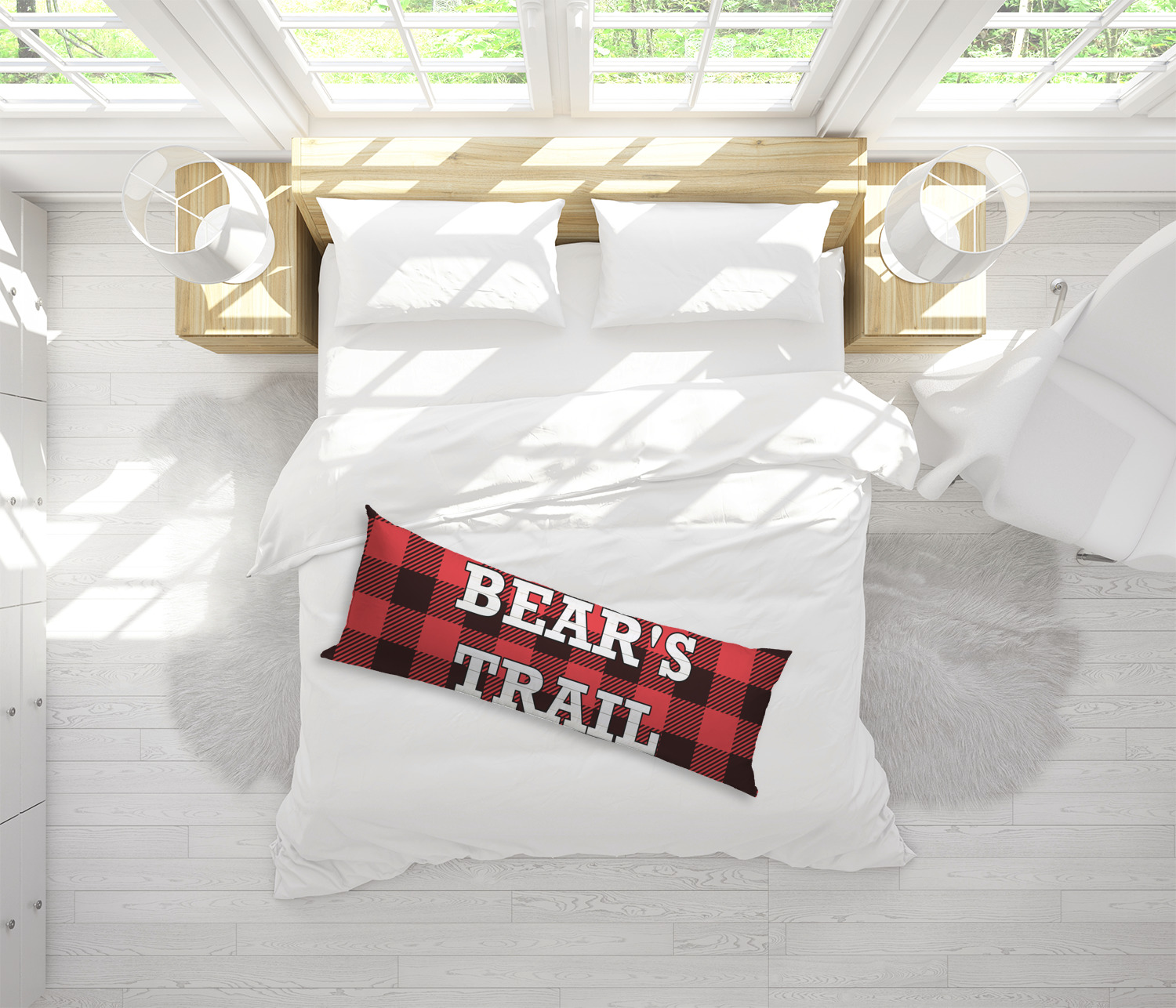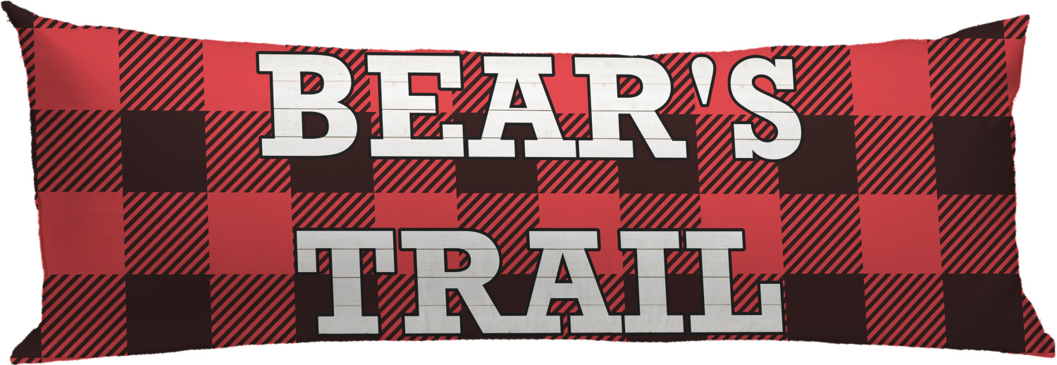 The main design is split into two asymmetrical sections. The top section is a diagonal red and black plaid, while the bottom is a light wood texture. On top of the wood texture is where your graphic and personalization go! The bear graphic and text below are filled with another black and red plaid.