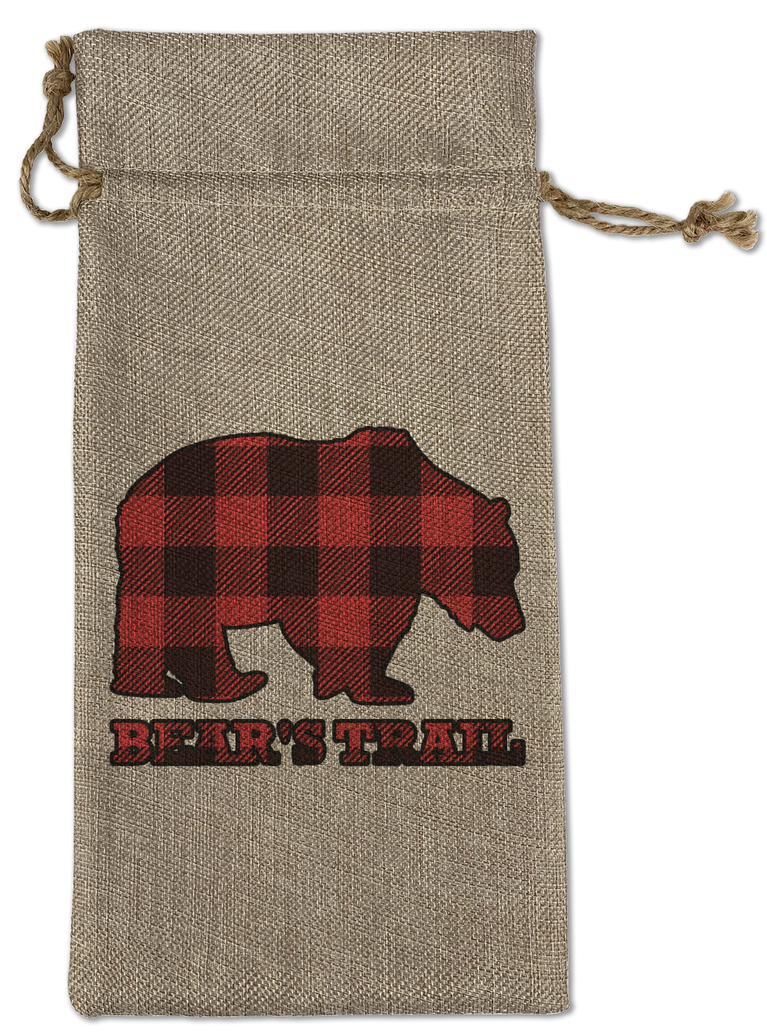 The main design is split into two asymmetrical sections. The top section is a diagonal red and black plaid, while the bottom is a light wood texture. On top of the wood texture is where your graphic and personalization go! The bear graphic and text below are filled with another black and red plaid.