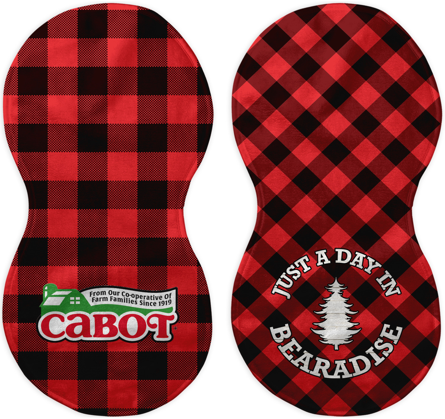The main design is split into two asymmetrical sections. The top section is a diagonal red and black plaid, while the bottom is a light wood texture. On top of the wood texture is where your graphic and personalization go! The bear graphic and text below are filled with another black and red plaid.