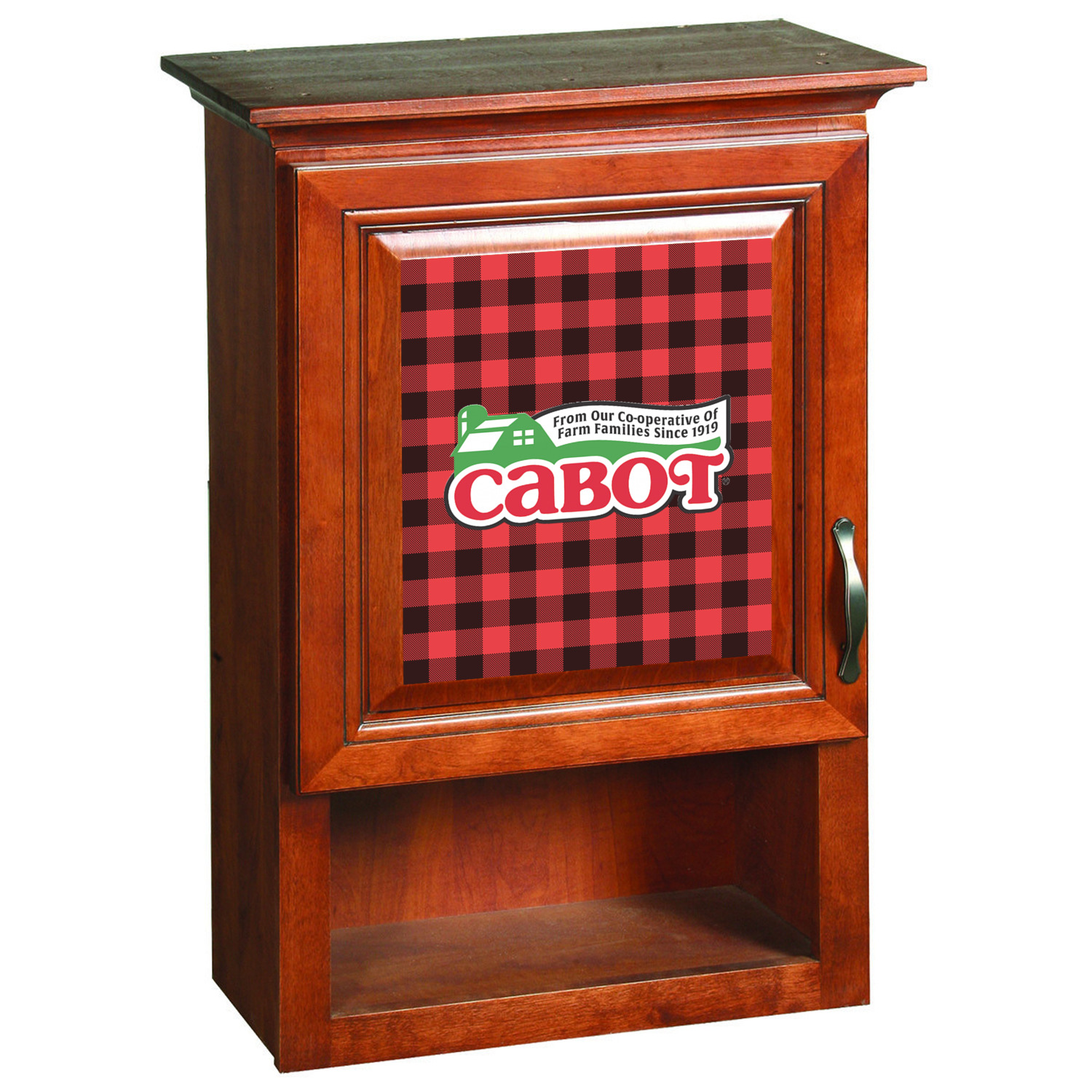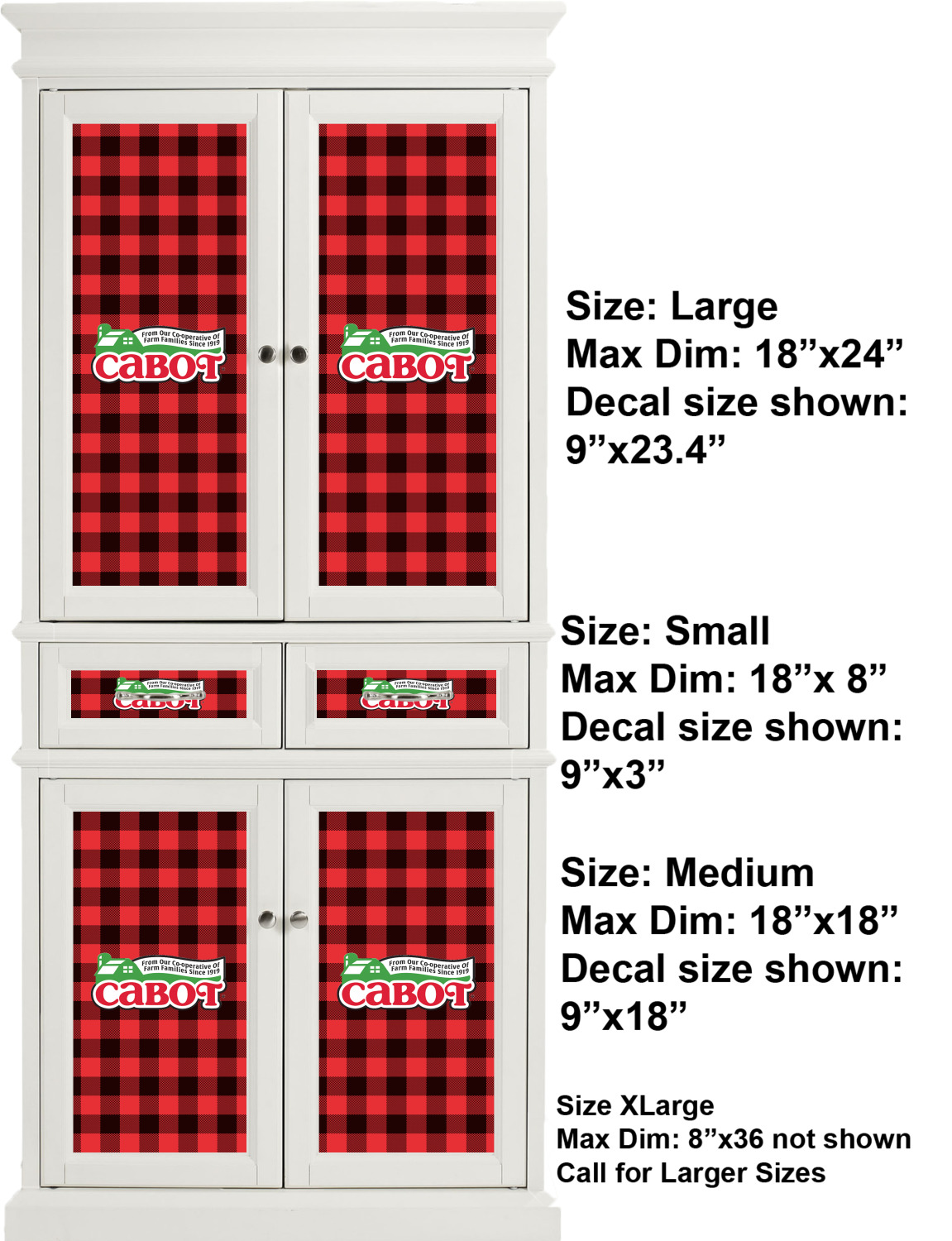 We print your customized design in full color, onto a high quality vinyl, covered with a glossy finish. For attachment to the cabinet, each cabinet sticker is accompanied by an easily applied, adhesive backing. The adhesive backing also guarantees a smooth removal or repositioning if desired. We sell these decals in four different sizes, but each size can be downsized appropriately to fit the needs of your kitchen. We offer a small, which is 18 by 8 inches, a medium, which is 18 by 18 inches, a large, at 24 by 18 inches, and an extra large, at 36 by 18 inches. We advise that you measure your cabinets first so you can make a properly informed purchase. For those who are interested in purchasing decals larger than 18 by 36 inches, please contact our team.