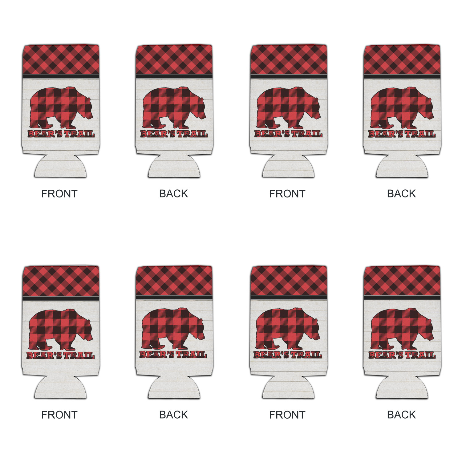 The main design is split into two asymmetrical sections. The top section is a diagonal red and black plaid, while the bottom is a light wood texture. On top of the wood texture is where your graphic and personalization go! The bear graphic and text below are filled with another black and red plaid.