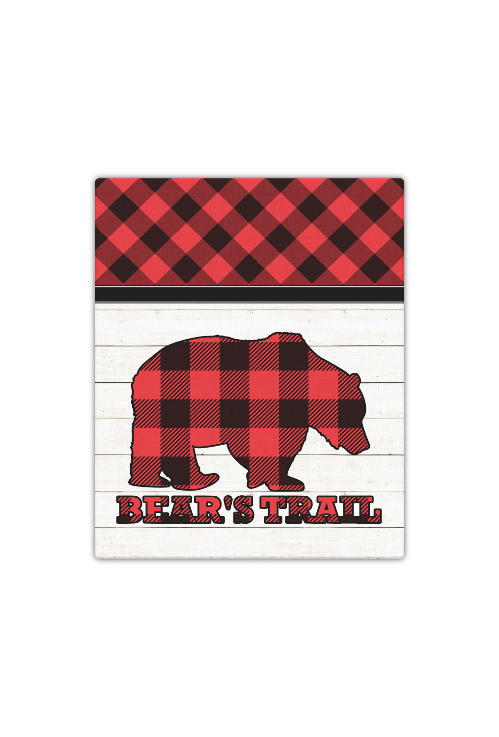 The main design is split into two asymmetrical sections. The top section is a diagonal red and black plaid, while the bottom is a light wood texture. On top of the wood texture is where your graphic and personalization go! The bear graphic and text below are filled with another black and red plaid.