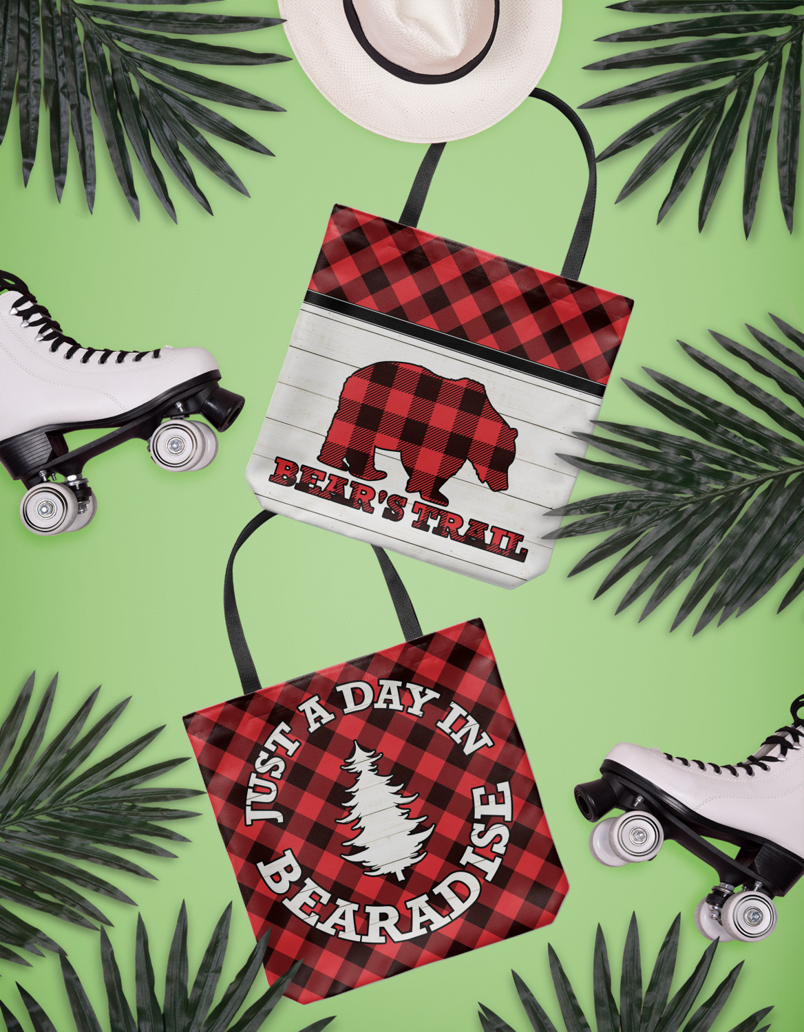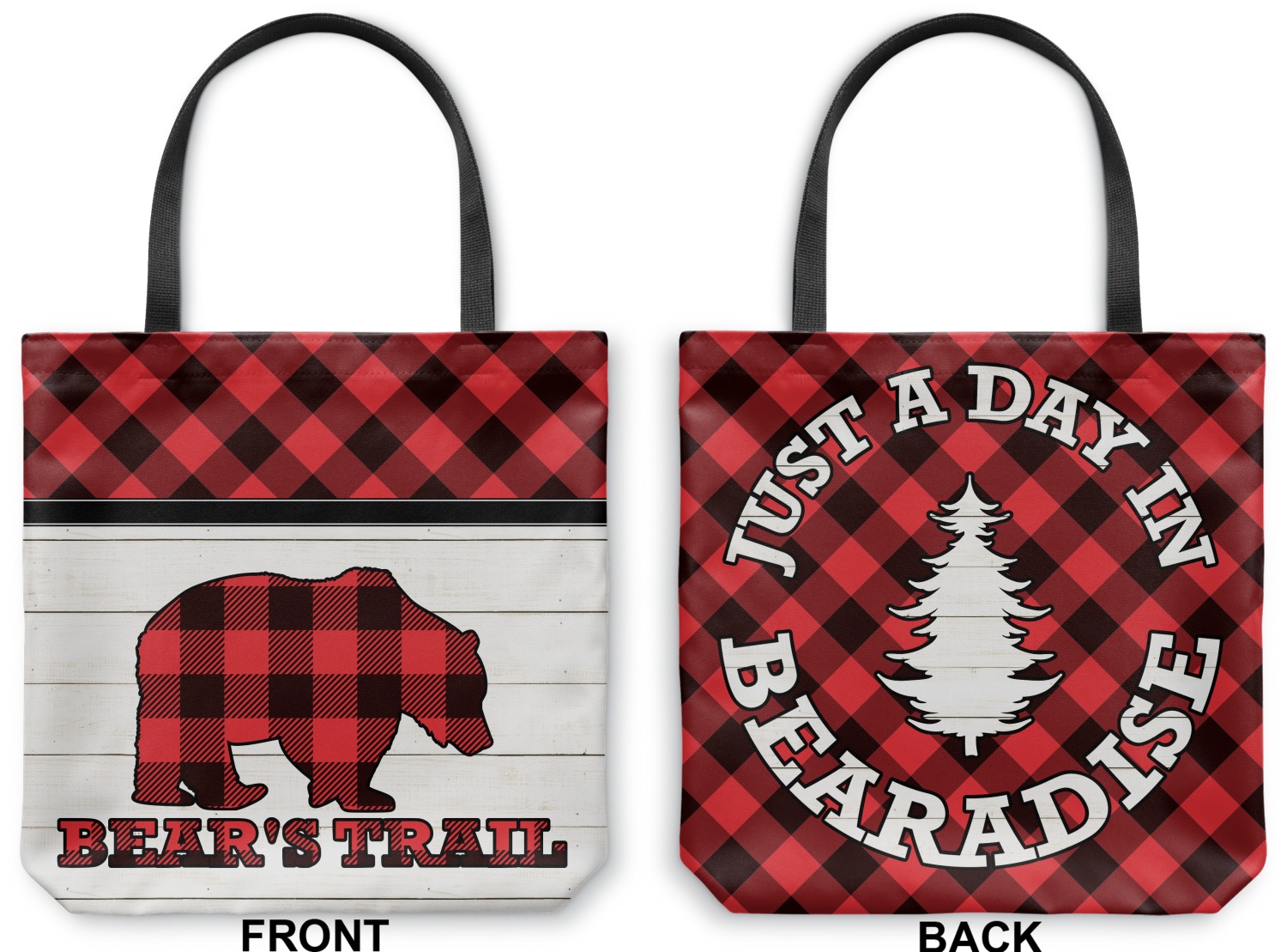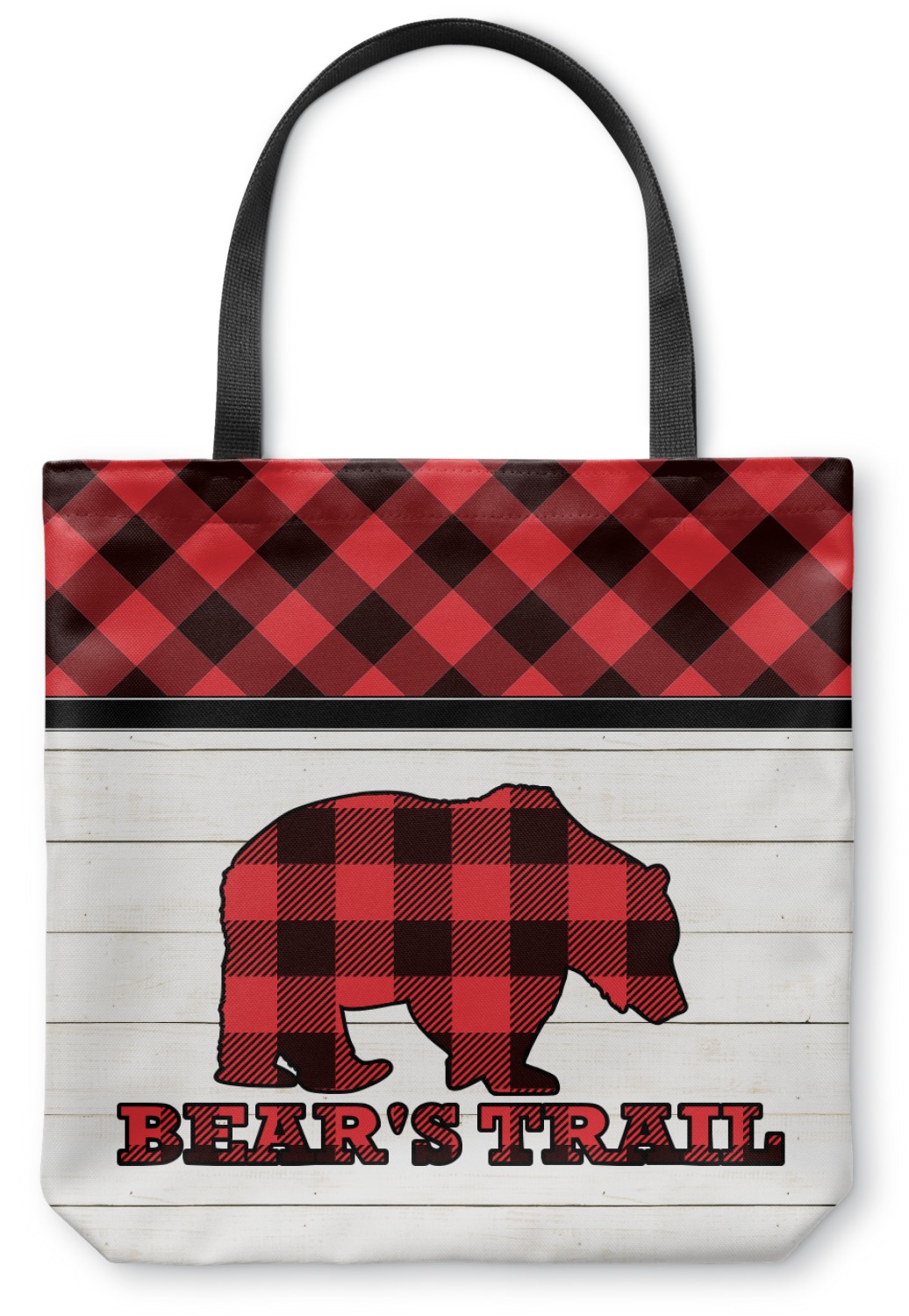 The main design is split into two asymmetrical sections. The top section is a diagonal red and black plaid, while the bottom is a light wood texture. On top of the wood texture is where your graphic and personalization go! The bear graphic and text below are filled with another black and red plaid.