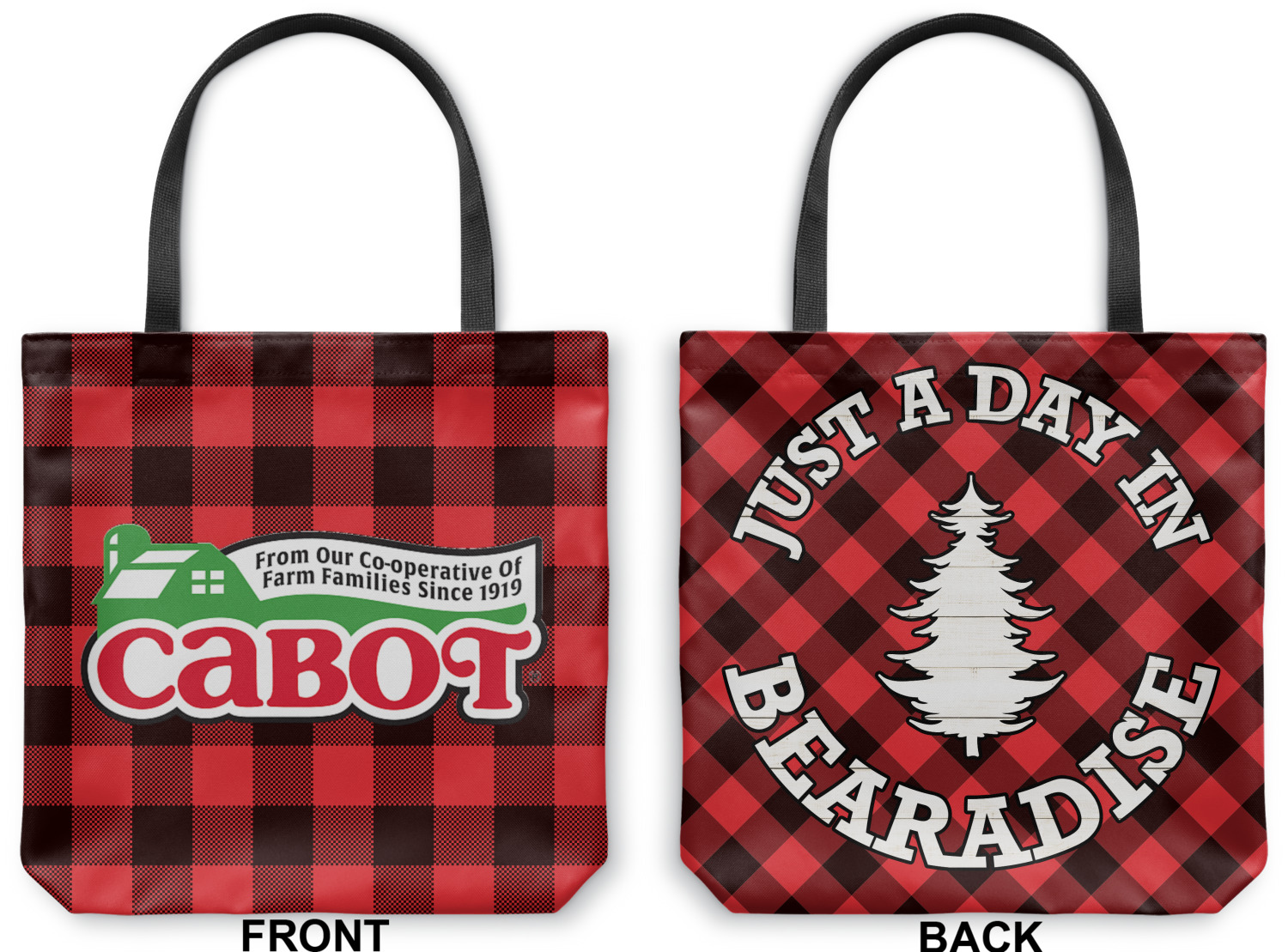 The main design is split into two asymmetrical sections. The top section is a diagonal red and black plaid, while the bottom is a light wood texture. On top of the wood texture is where your graphic and personalization go! The bear graphic and text below are filled with another black and red plaid.