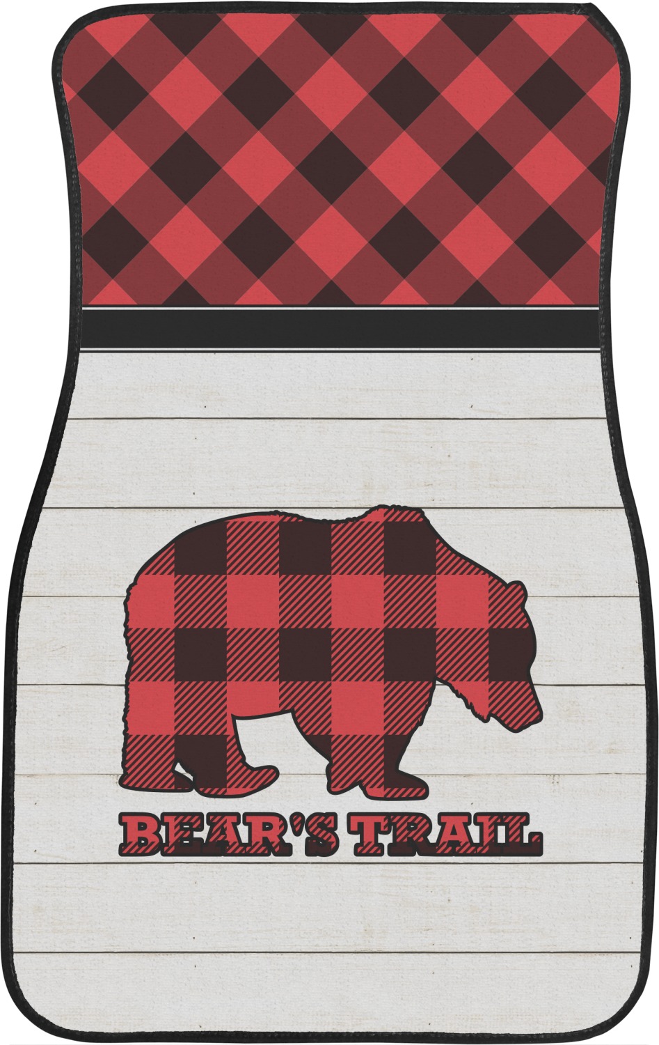 The main design is split into two asymmetrical sections. The top section is a diagonal red and black plaid, while the bottom is a light wood texture. On top of the wood texture is where your graphic and personalization go! The bear graphic and text below are filled with another black and red plaid.