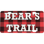 The main design is split into two asymmetrical sections. The top section is a diagonal red and black plaid, while the bottom is a light wood texture. On top of the wood texture is where your graphic and personalization go! The bear graphic and text below are filled with another black and red plaid.