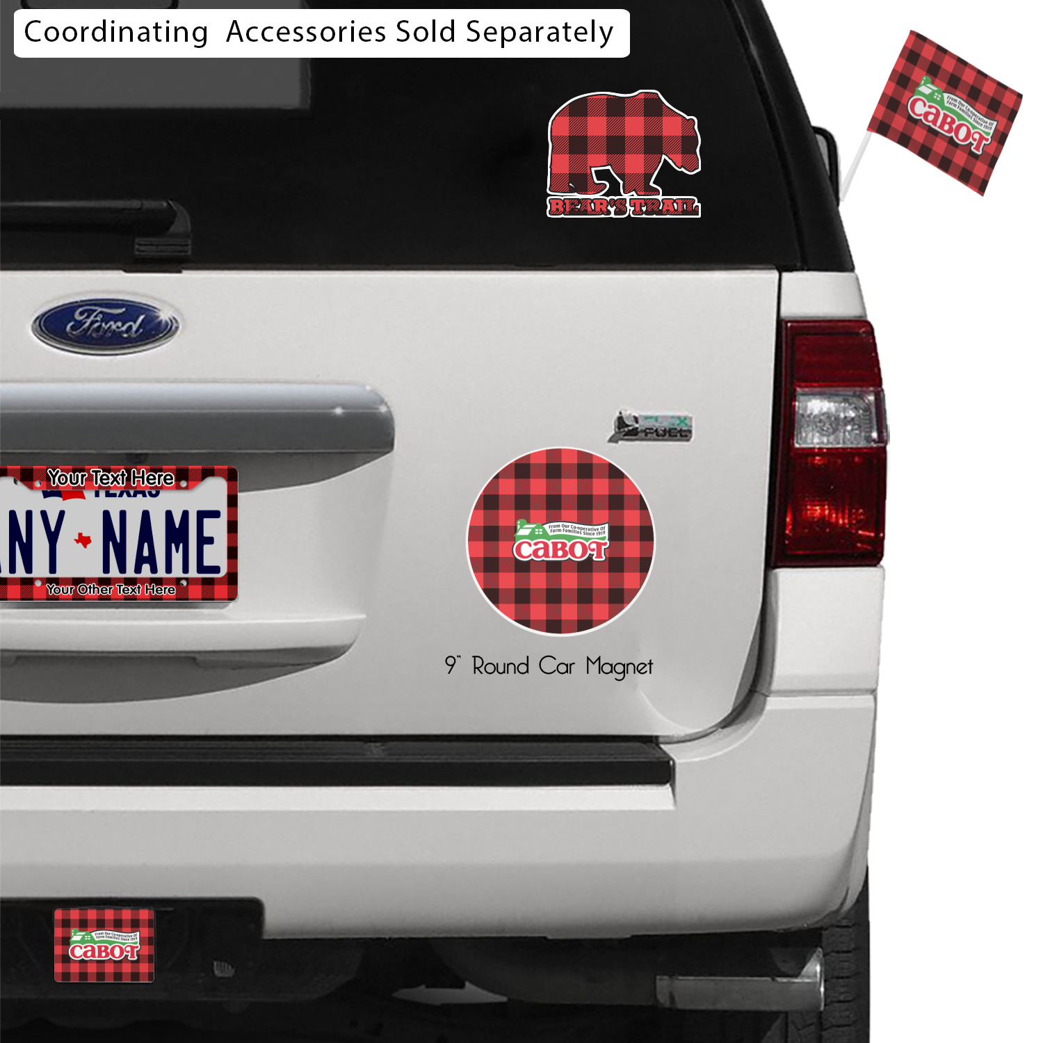 The coordinating design has a pine tree filled with a wood texture and text surrounding it. All this sits on a black and red plaid background.