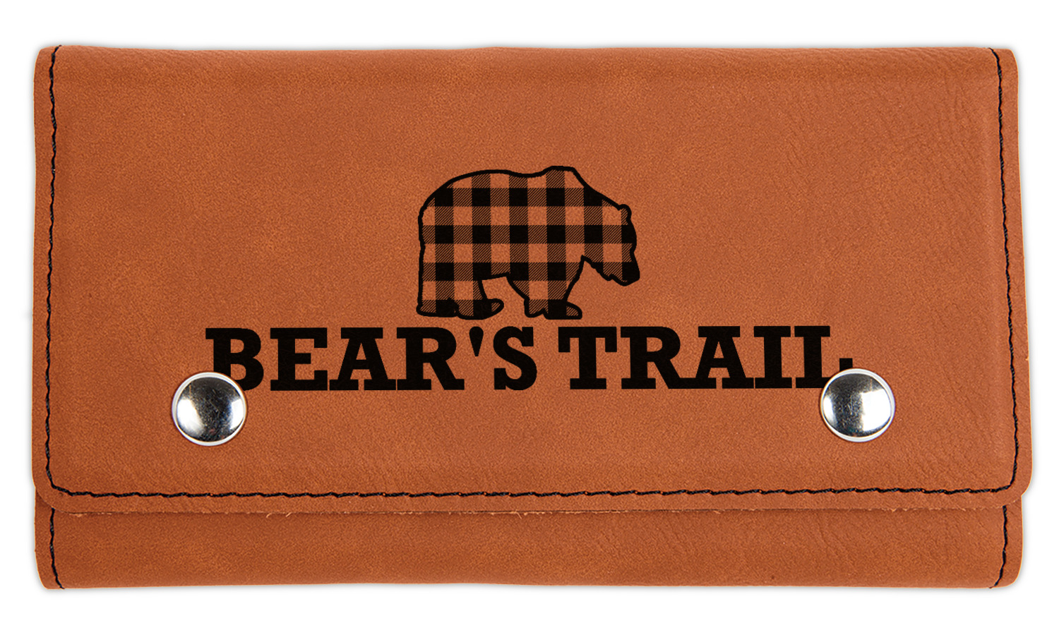 The main design is split into two asymmetrical sections. The top section is a diagonal red and black plaid, while the bottom is a light wood texture. On top of the wood texture is where your graphic and personalization go! The bear graphic and text below are filled with another black and red plaid.