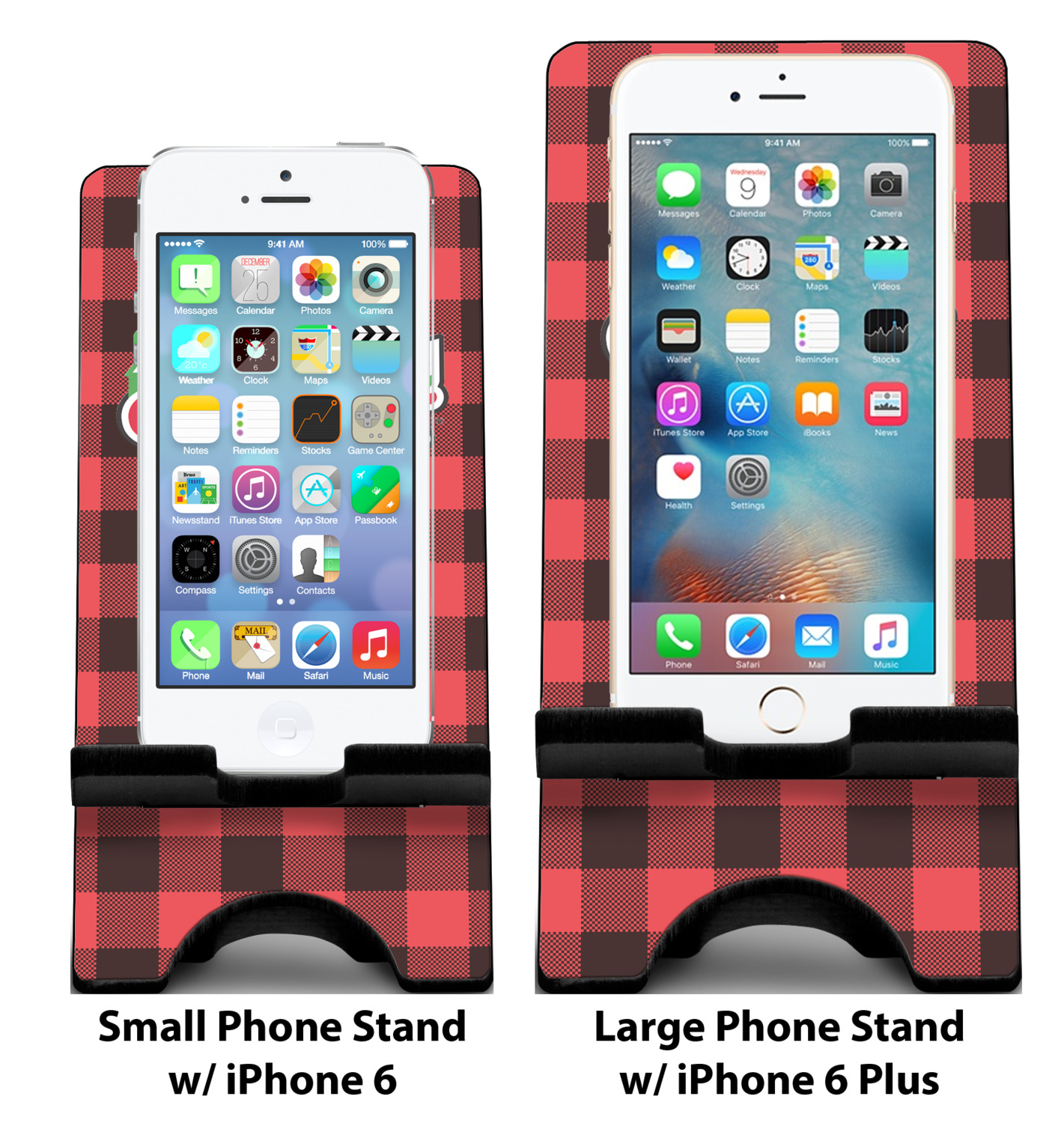 To meet your needs, we offer four variations of this IPhone stand. The backboard of the first version is shaped as a plain, yet sleek rectangle, and is available in two sizes. Our smaller size is approximately 4 by 3.25 by 7 inches, while the larger model is 4 by 3.77 by 8.5 inches. Alongside this model, we also provide you with a more decorative option. The upper part of our second version features a curved edge, for a classy, suave appearance. This phone holder is also sold in two sizes: a smaller version, which is 4 by 3.25 by 7 inches, and our larger model, which is 4 by 3.77 by 8.5 inches. Both models will support large phones, but the larger model is better if you wish to proudly display your personalized design.