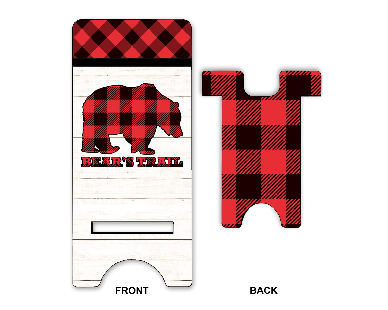 The main design is split into two asymmetrical sections. The top section is a diagonal red and black plaid, while the bottom is a light wood texture. On top of the wood texture is where your graphic and personalization go! The bear graphic and text below are filled with another black and red plaid.
