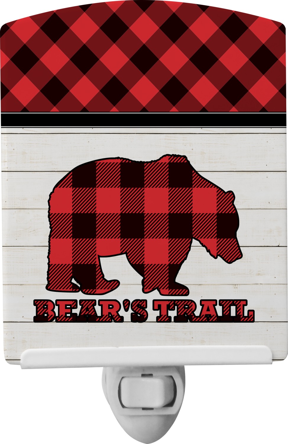 The main design is split into two asymmetrical sections. The top section is a diagonal red and black plaid, while the bottom is a light wood texture. On top of the wood texture is where your graphic and personalization go! The bear graphic and text below are filled with another black and red plaid.