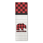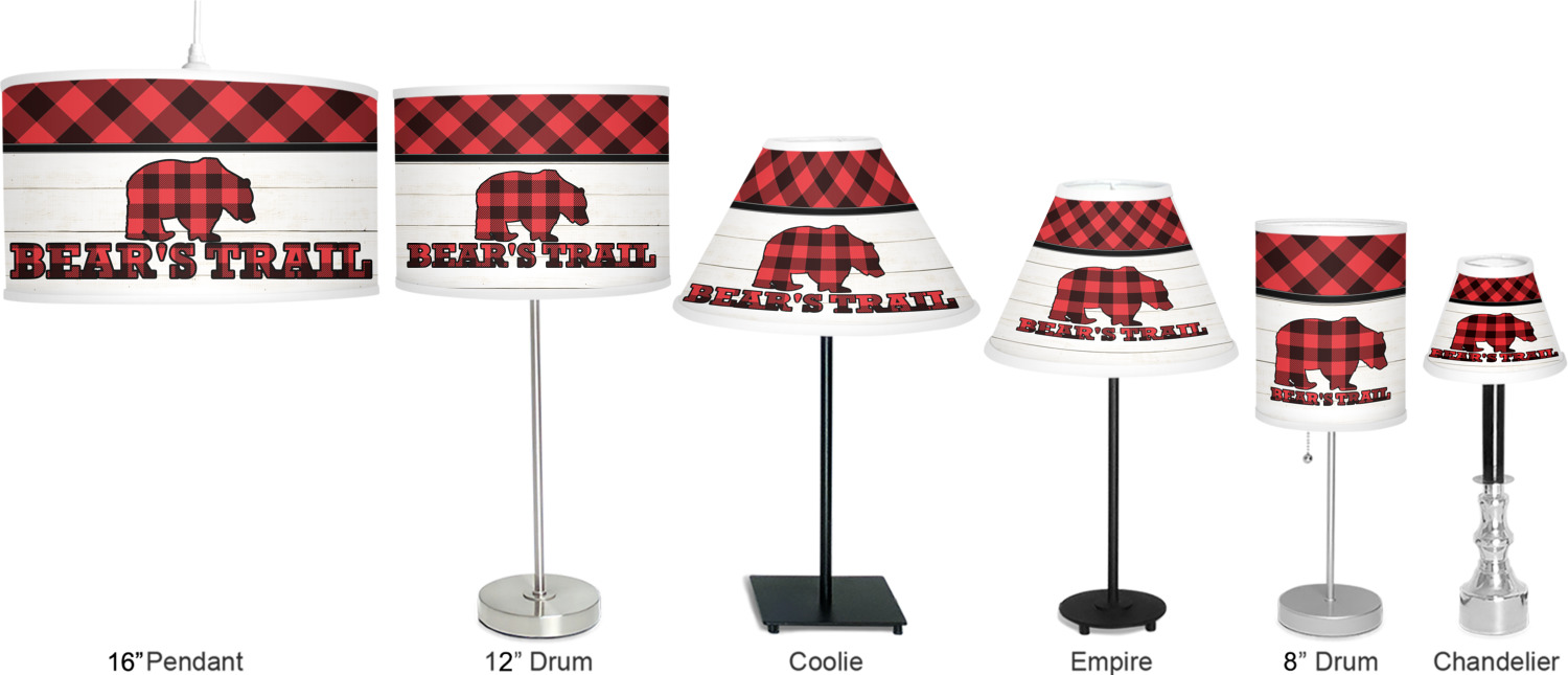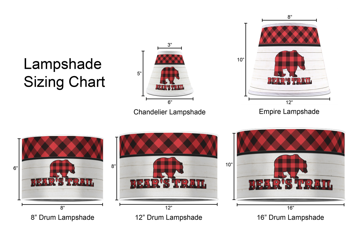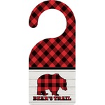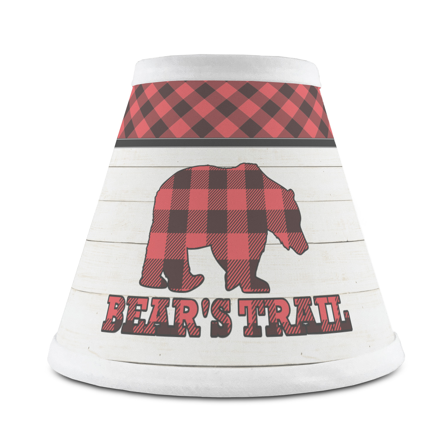 The main design is split into two asymmetrical sections. The top section is a diagonal red and black plaid, while the bottom is a light wood texture. On top of the wood texture is where your graphic and personalization go! The bear graphic and text below are filled with another black and red plaid.