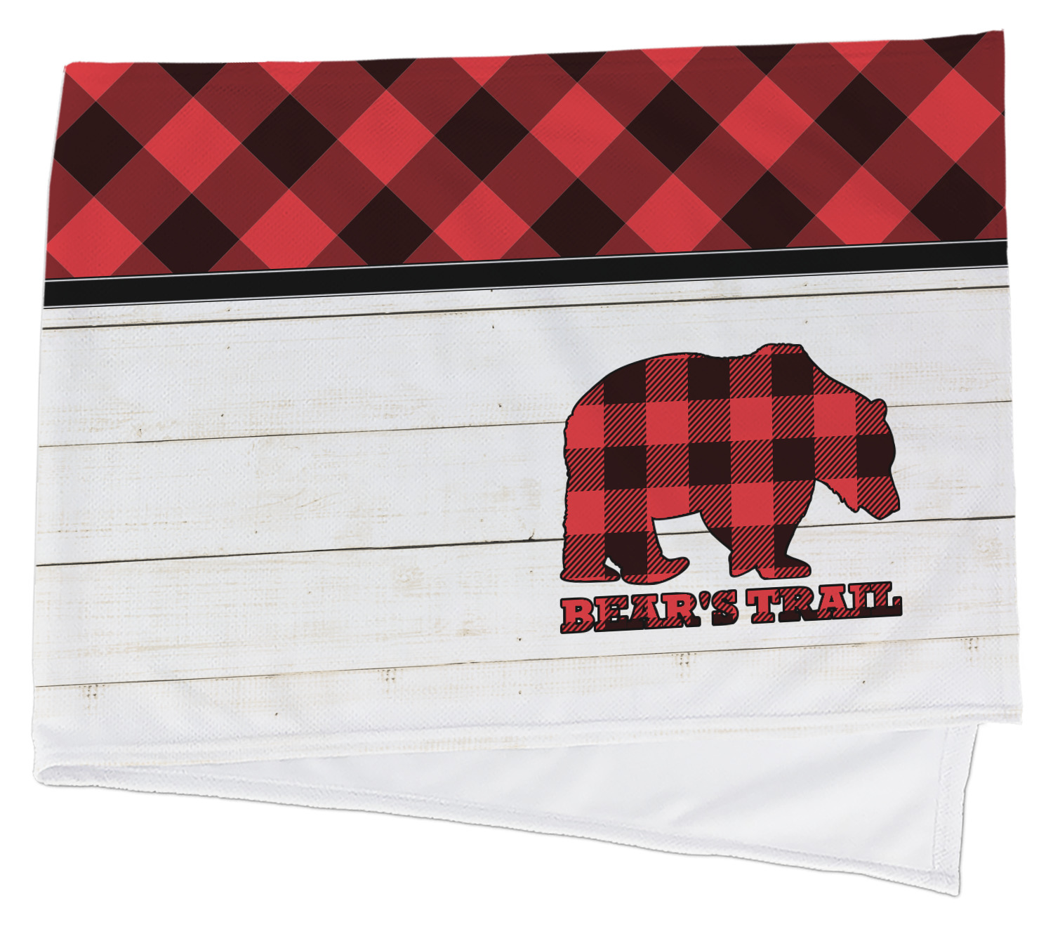 The main design is split into two asymmetrical sections. The top section is a diagonal red and black plaid, while the bottom is a light wood texture. On top of the wood texture is where your graphic and personalization go! The bear graphic and text below are filled with another black and red plaid.