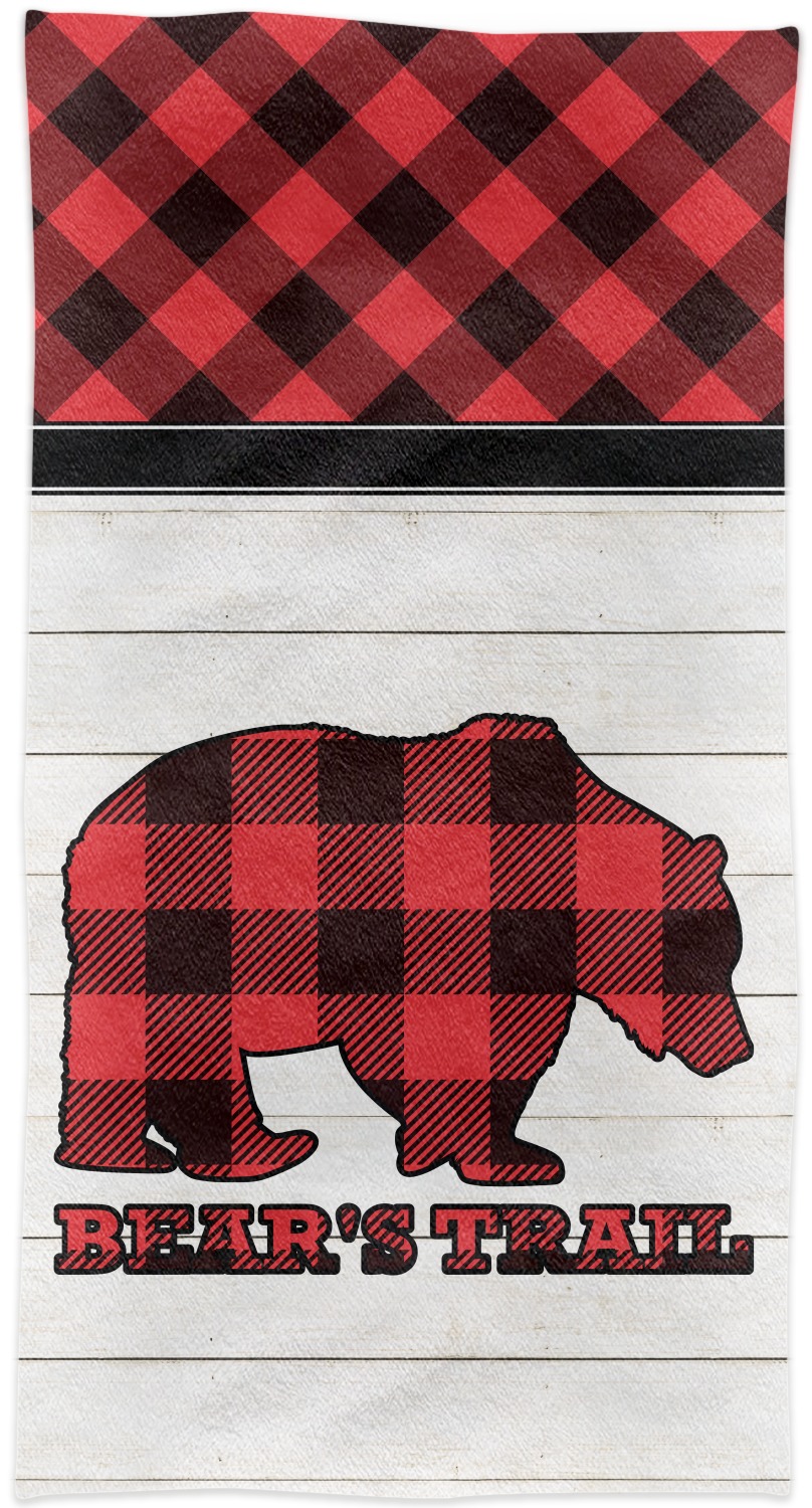 The main design is split into two asymmetrical sections. The top section is a diagonal red and black plaid, while the bottom is a light wood texture. On top of the wood texture is where your graphic and personalization go! The bear graphic and text below are filled with another black and red plaid.